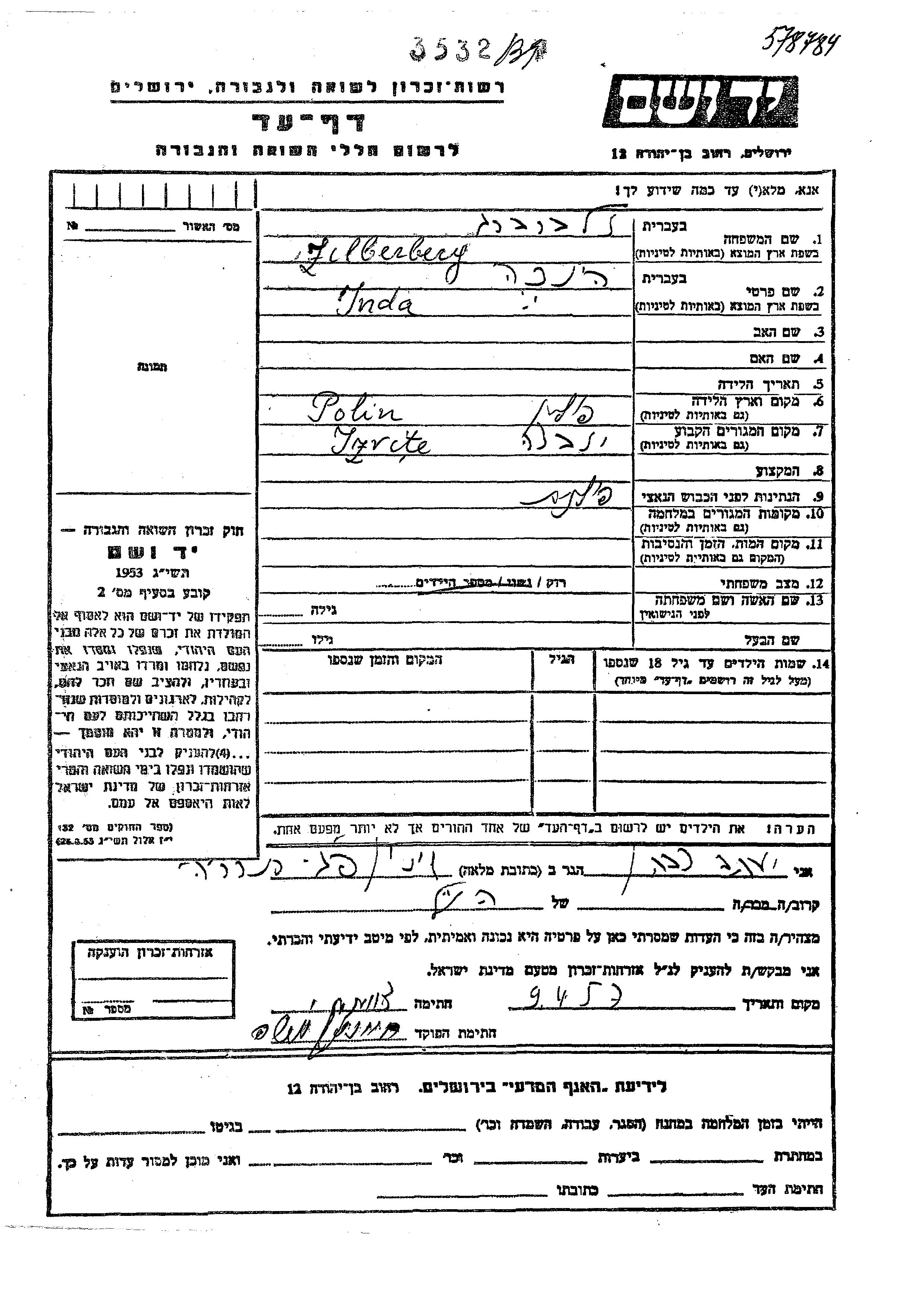Inda Zilberberg wurde in Polen geboren. Sie war Ledig. Vor dem Zweiten Weltkrieg lebte sie in Izbica, Polen.