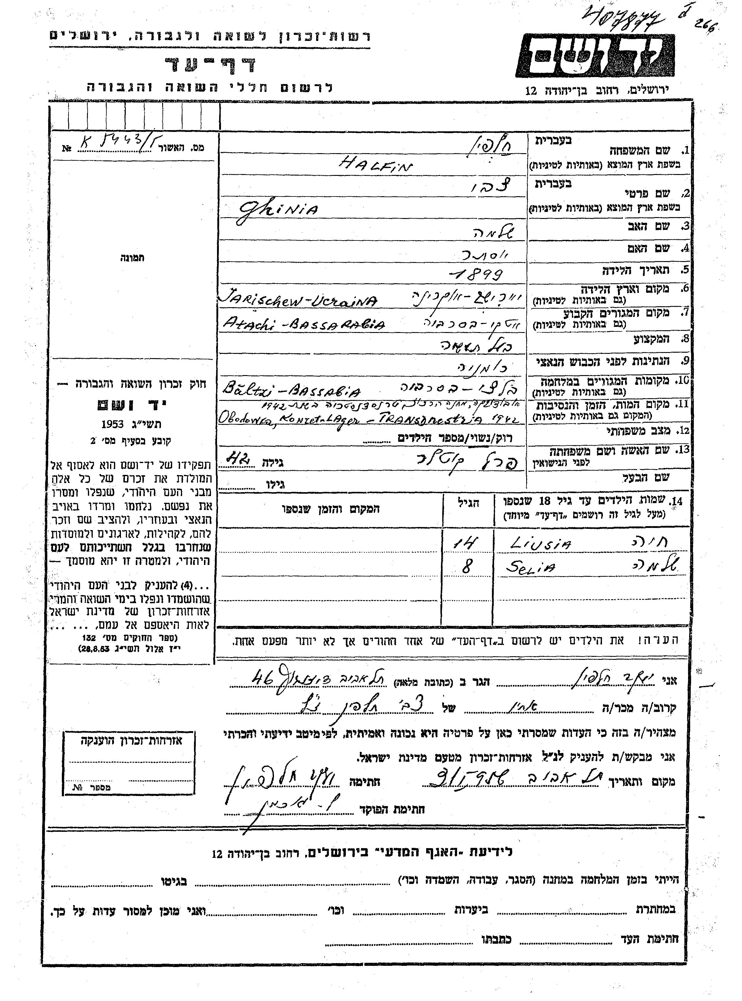 Liusia Khaia Halfin wurde Sie war die Tochter von Ghinia Tzvi und Perel, geb. Kotler. Sie war Kind. Vor dem Zweiten Weltkrieg lebte sie in Atachi, Rumänien. Während des Krieges war sie in Balti, Rumänien.