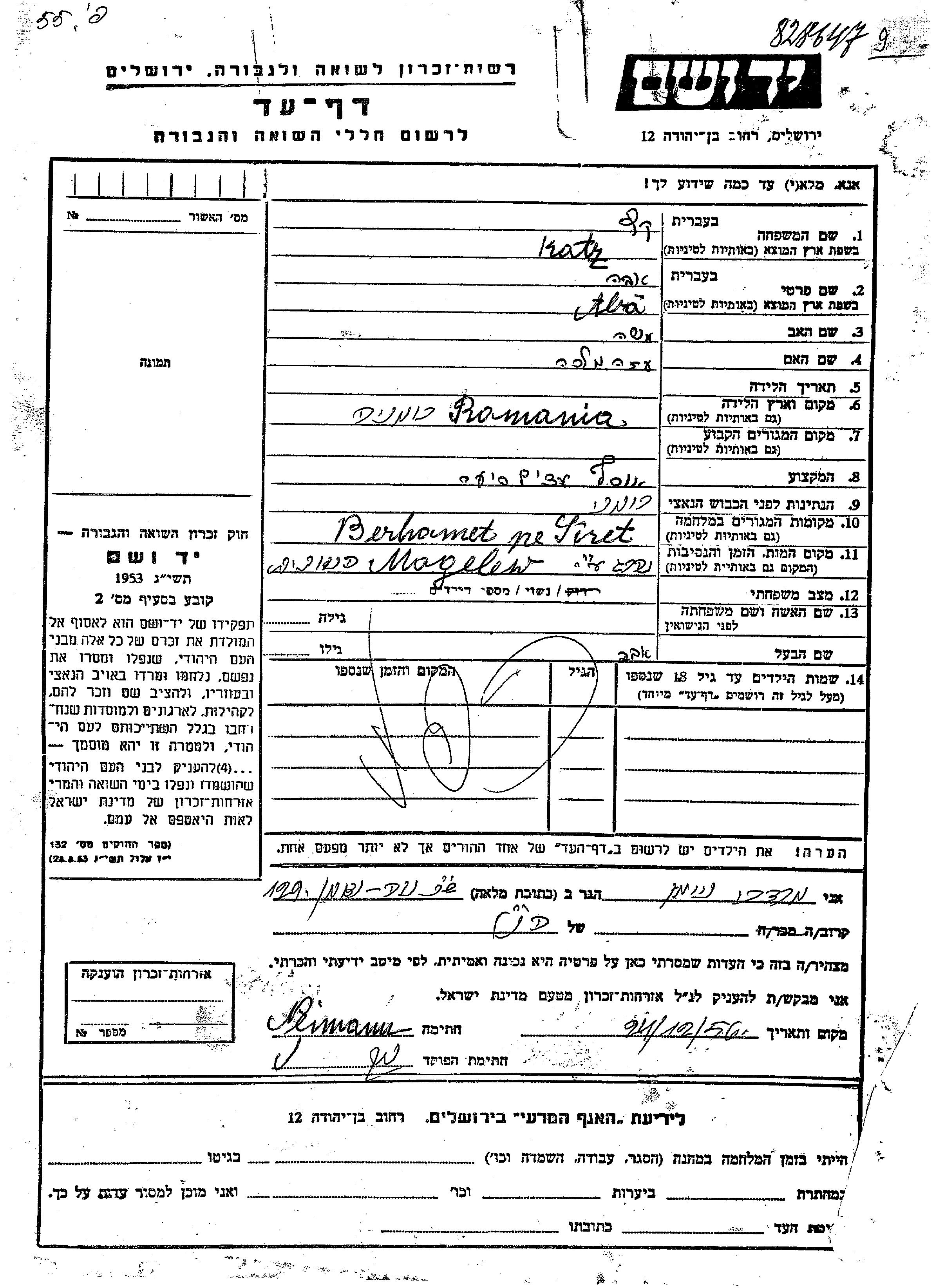 Aba Katz wurde in Rumänien geboren. Er war der Sohn von Moshe und Ester Malka. Er war אוסף עצים ביער und Verheiratet. Während des Krieges war er in Berhomet, Rumänien.