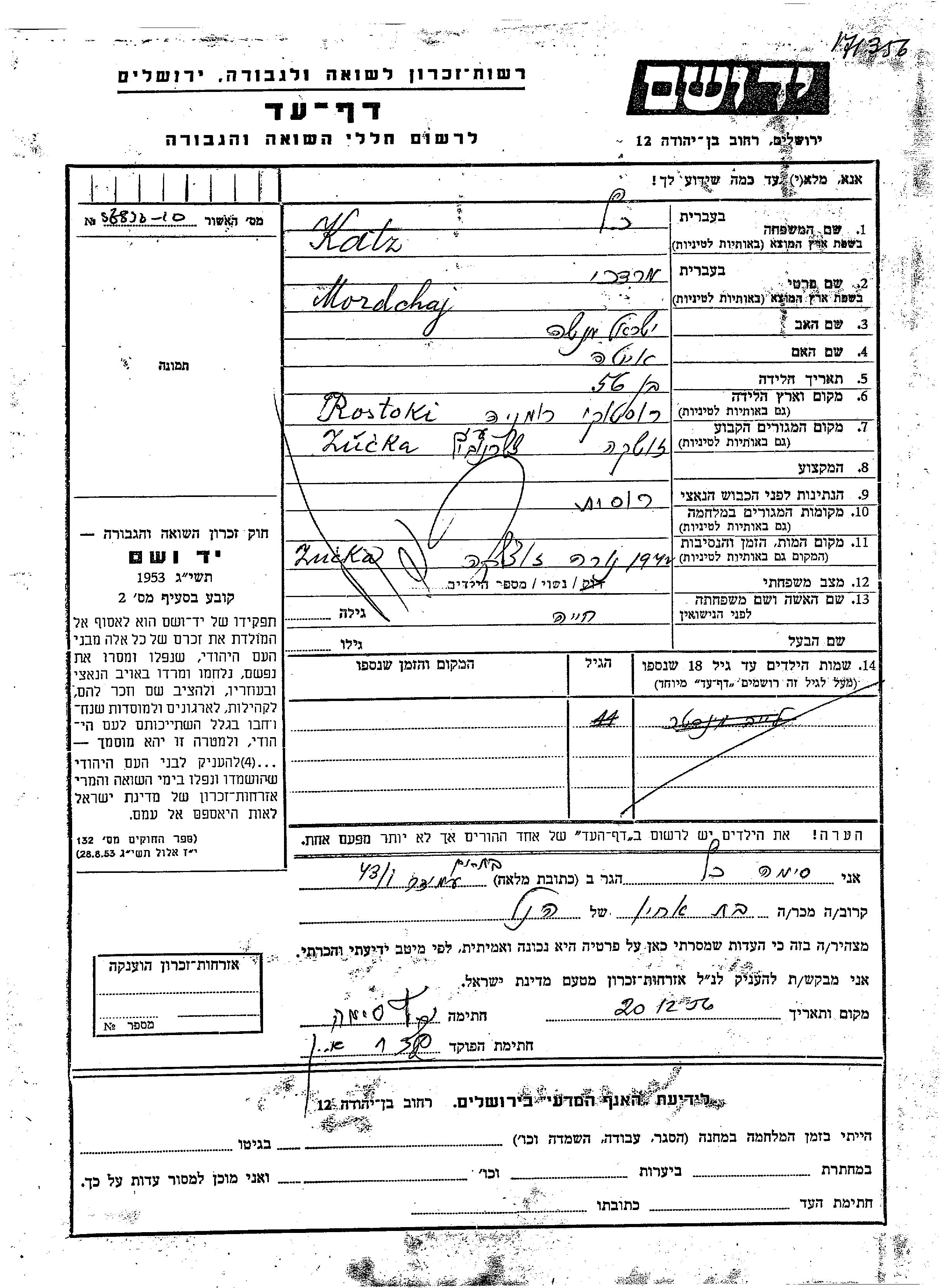 Mordchaj Katz wurde in Rastoace, Rumänien geboren. Er war der Sohn von Yisrael Menashe und Ita. Er war mit Khaia Verheiratet. Vor dem Zweiten Weltkrieg lebte er in Jucica, Rumänien. Während des Krieges war er in Jucica, Rumänien.