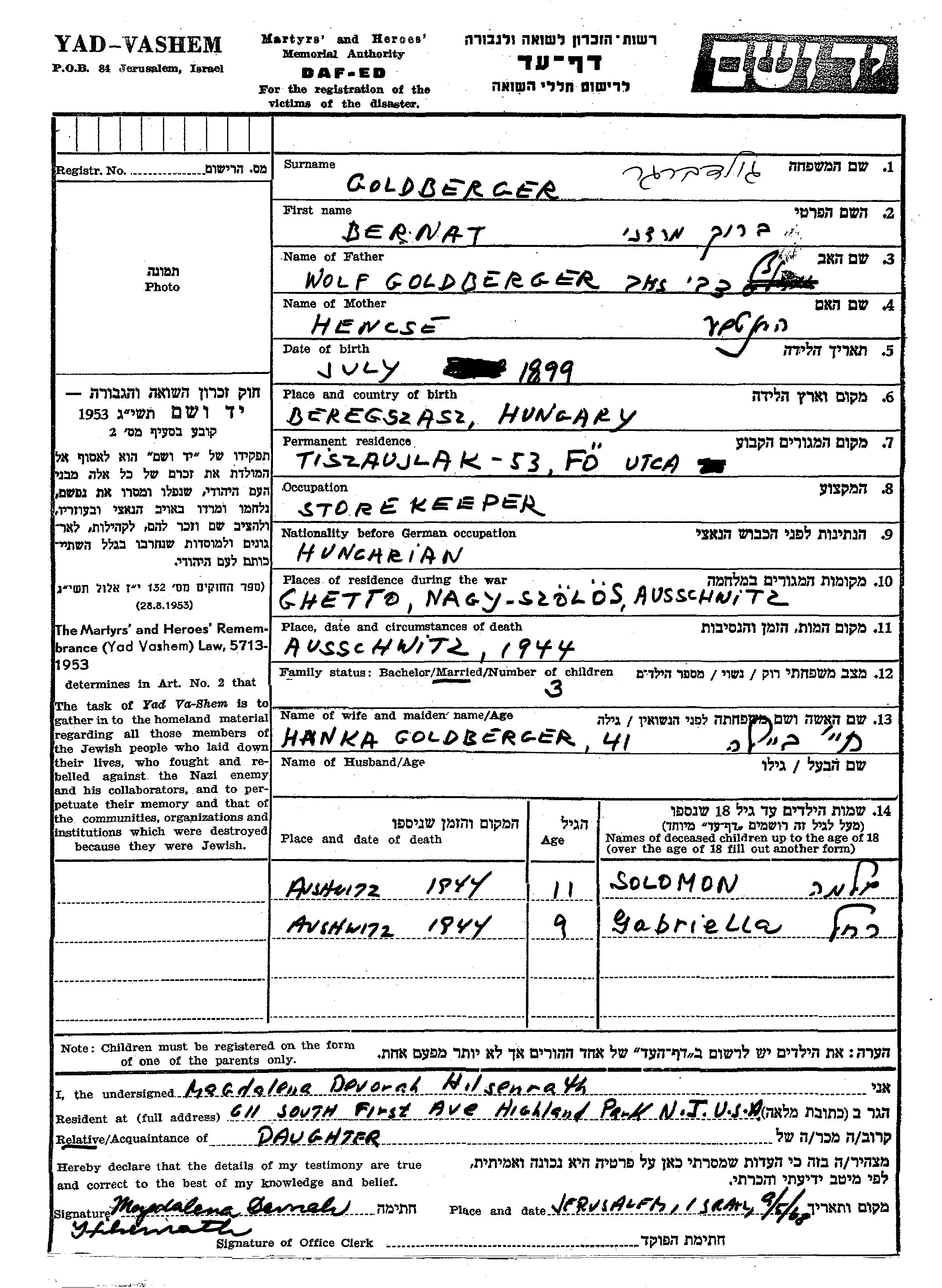 Solomon Goldberger wurde Er war der Sohn von Bernat Barukh Mordekhai und Hanka Khai Beila. Er war Kind. Vor dem Zweiten Weltkrieg lebte er in Tiszaujlak, Tschechoslowakei. Während des Krieges war er in Nagyszollos, Tschechoslowakei.