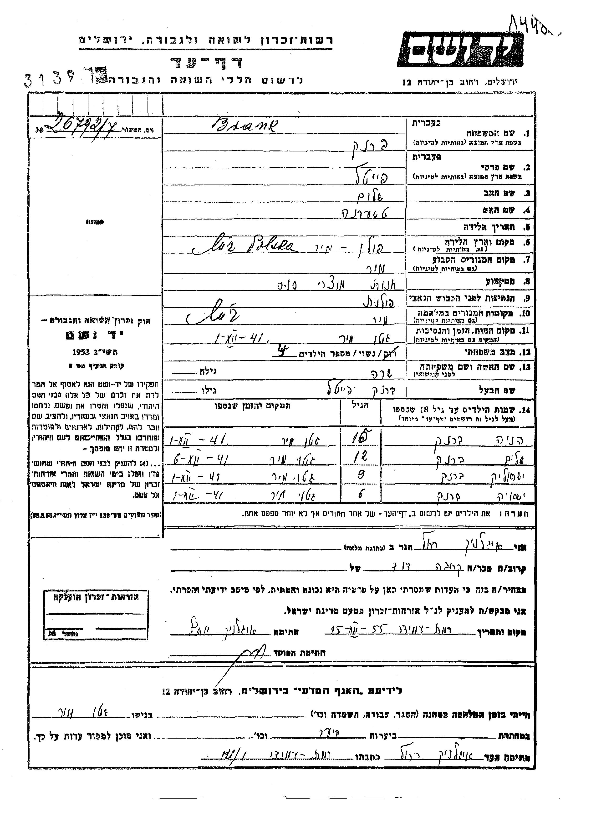 Israelik Brank Baranek wurde Er war der Sohn von Faitel und Sara. Er war Kind. Vor dem Zweiten Weltkrieg lebte er in Mir, Polen. Während des Krieges war er in Mir, Polen.