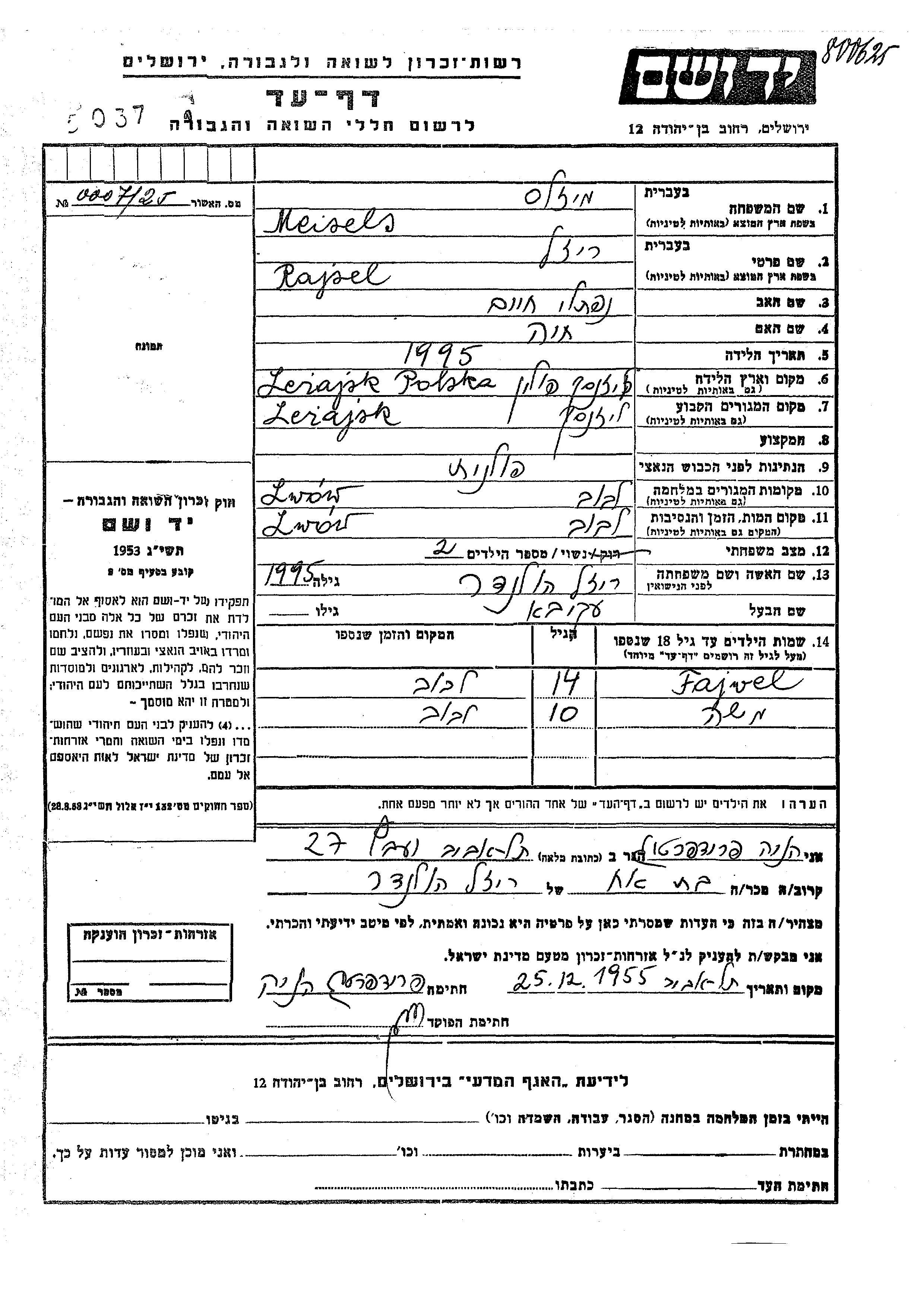Moshe Meisels wurde Er war der Sohn von Akiva und Rajsel, geb. Holander. Er war Kind. Vor dem Zweiten Weltkrieg lebte er in Lezajsk, Polen. Während des Krieges war er in Lwow, Polen.