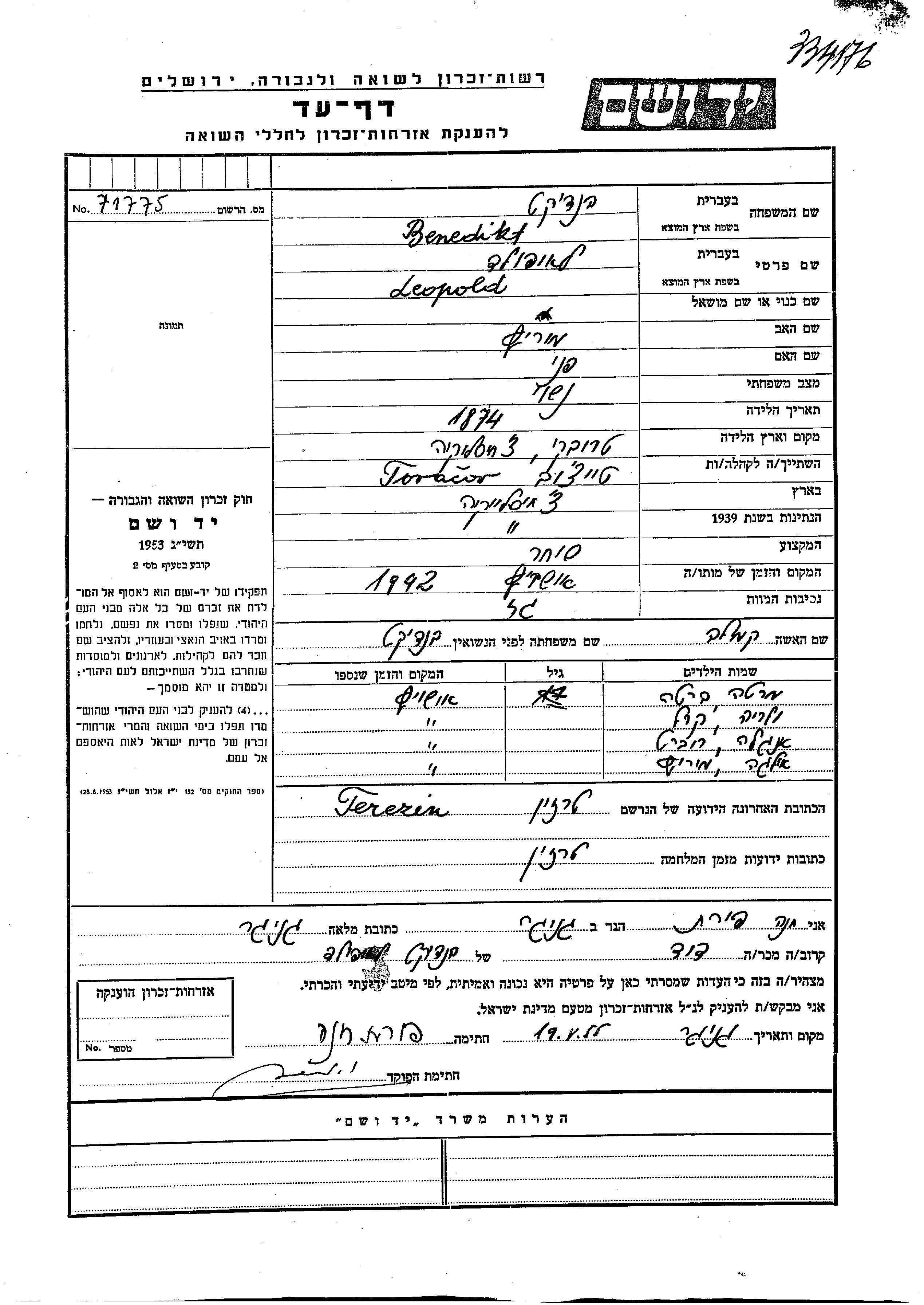 Marta Benedict wurde Er/sie war der/ die Sohn/Tochter von Leopold und Kamila. Er/Sie war Kind. Vor dem Zweiten Weltkrieg er/sie in Tovacov, Tschechoslowakei. Während des Krieges war er/sie in Terezin, Tschechoslowakei.