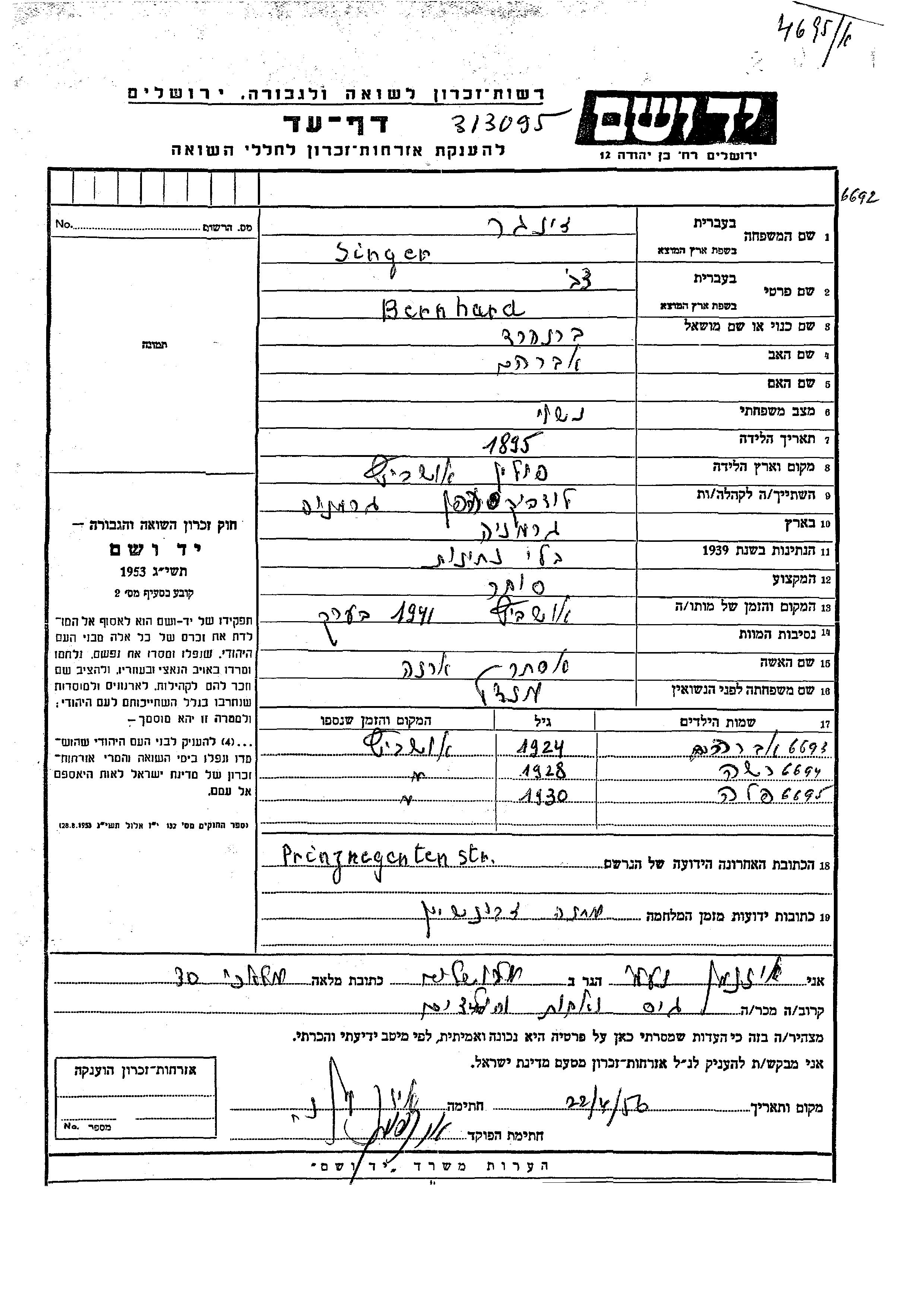 Avraham Singer wurde im Jahr 1924 geboren. Er war der Sohn von Bernhard Tzvi und Ester Erna, geb. Mandel. Er war Kind. Vor dem Zweiten Weltkrieg lebte er in Ludwigshafen, Deutsches Reich. Während des Krieges war er in Zbaszyn, Polen.
