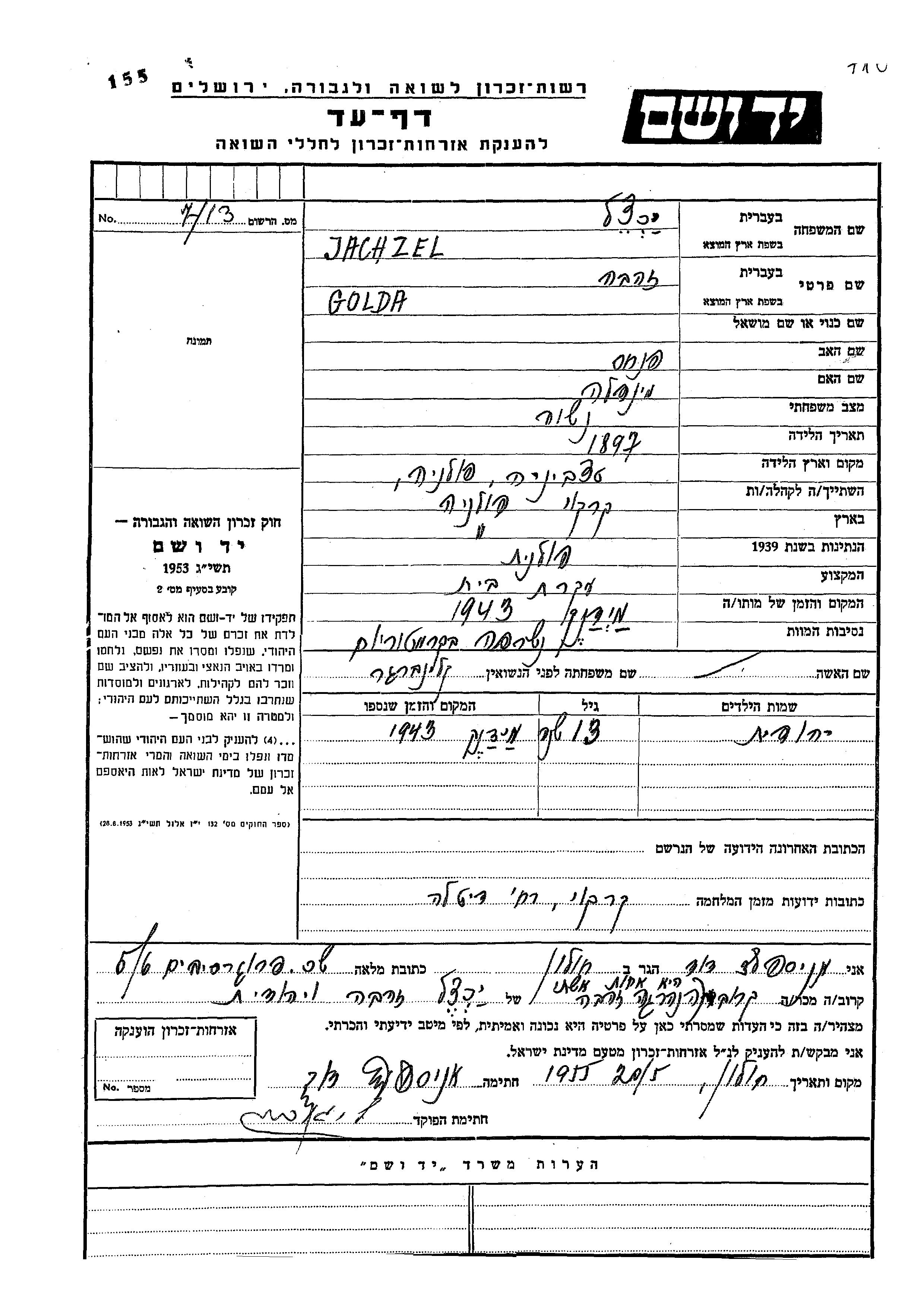 Yehudit Jachzel wurde Sie war die Tochter von Golda Zahava, geb. Klenberger. Sie war Kind. Vor dem Zweiten Weltkrieg lebte sie in Krakow, Polen. Während des Krieges war sie in Krakow, Polen.