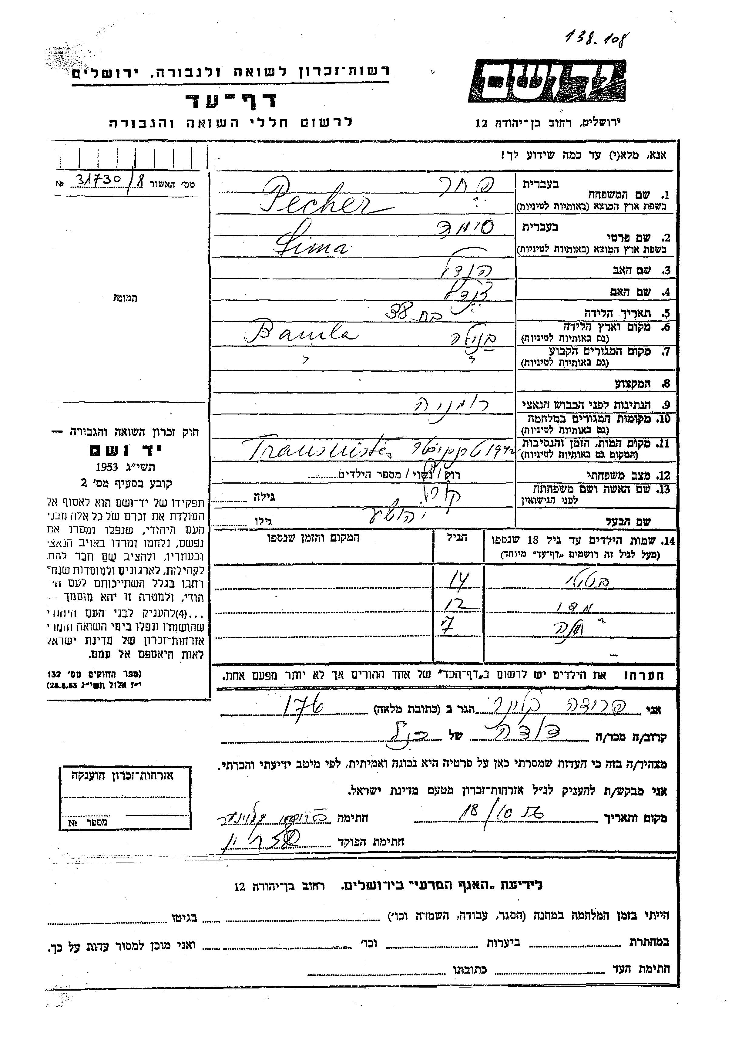 Medi Pecher wurde Sie war die Tochter von Yehoshua und Sima, geb. Kurtz. Sie war Kind. Vor dem Zweiten Weltkrieg lebte sie in Banila, Rumänien.