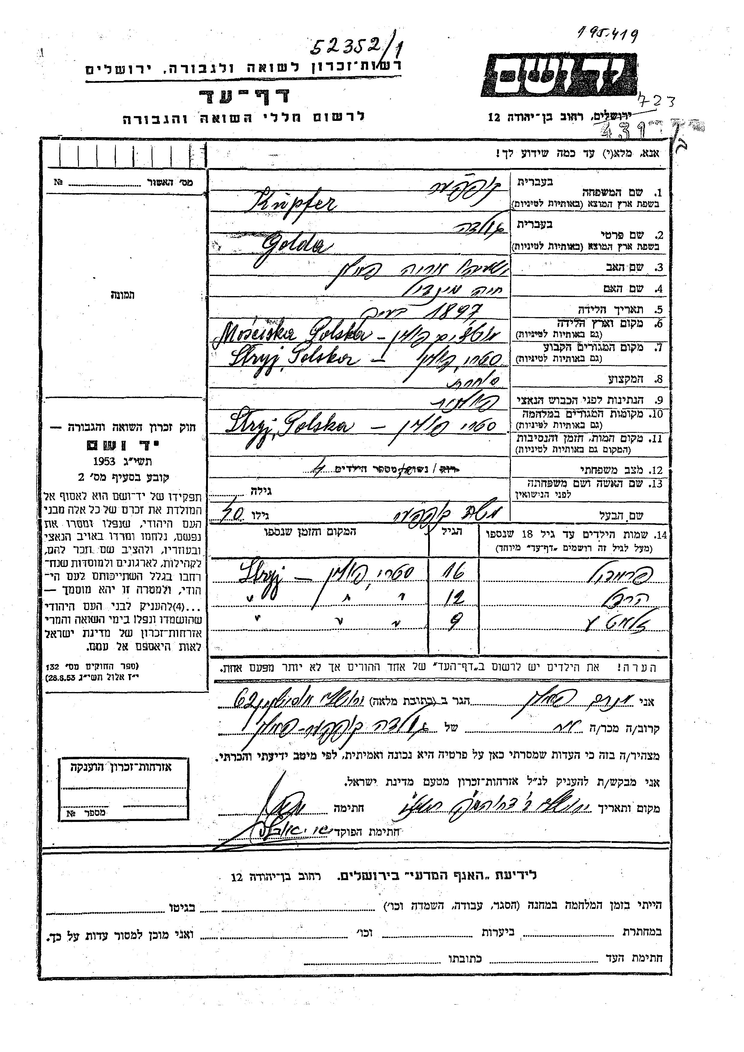 Freidil Kupfer wurde Sie war die Tochter von Moshe und Golda, geb. Falk. Sie war Kind. Vor dem Zweiten Weltkrieg lebte sie in Stryj, Polen. Während des Krieges war sie in Stryj, Polen.