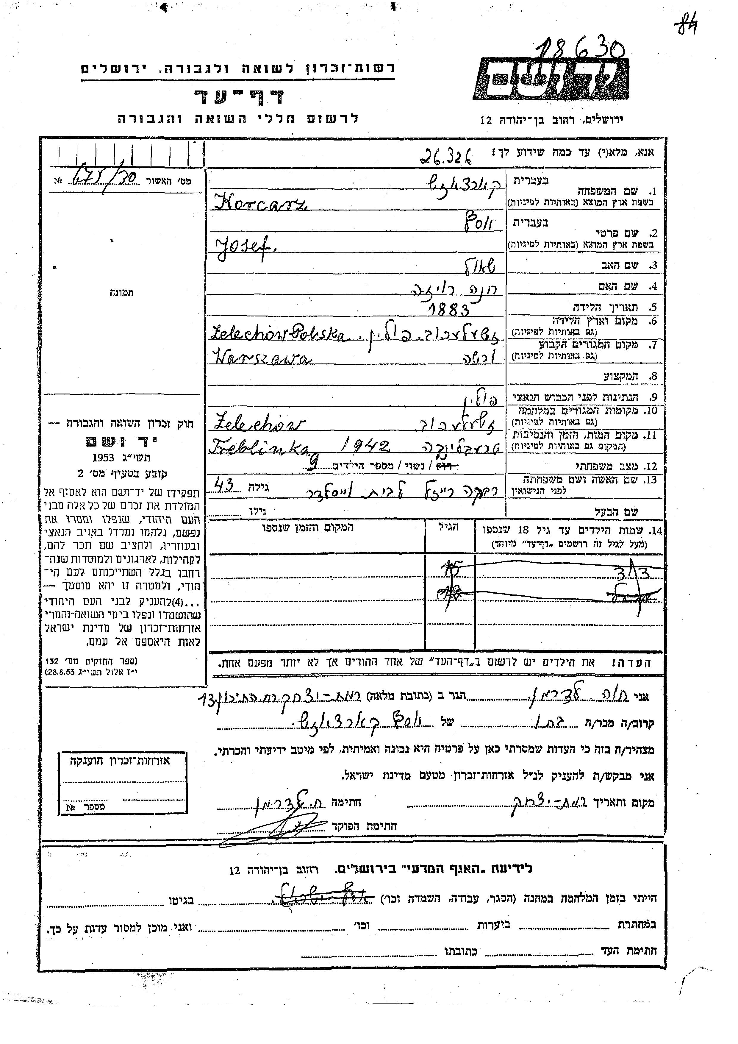 David Korcarz Kardash wurde Er war der Sohn von Josef und Rivka Reizl, geb. Veisleder. Er war Kind. Vor dem Zweiten Weltkrieg lebte er in Varsha, Polen. Während des Krieges war er in Zelechow, Polen.