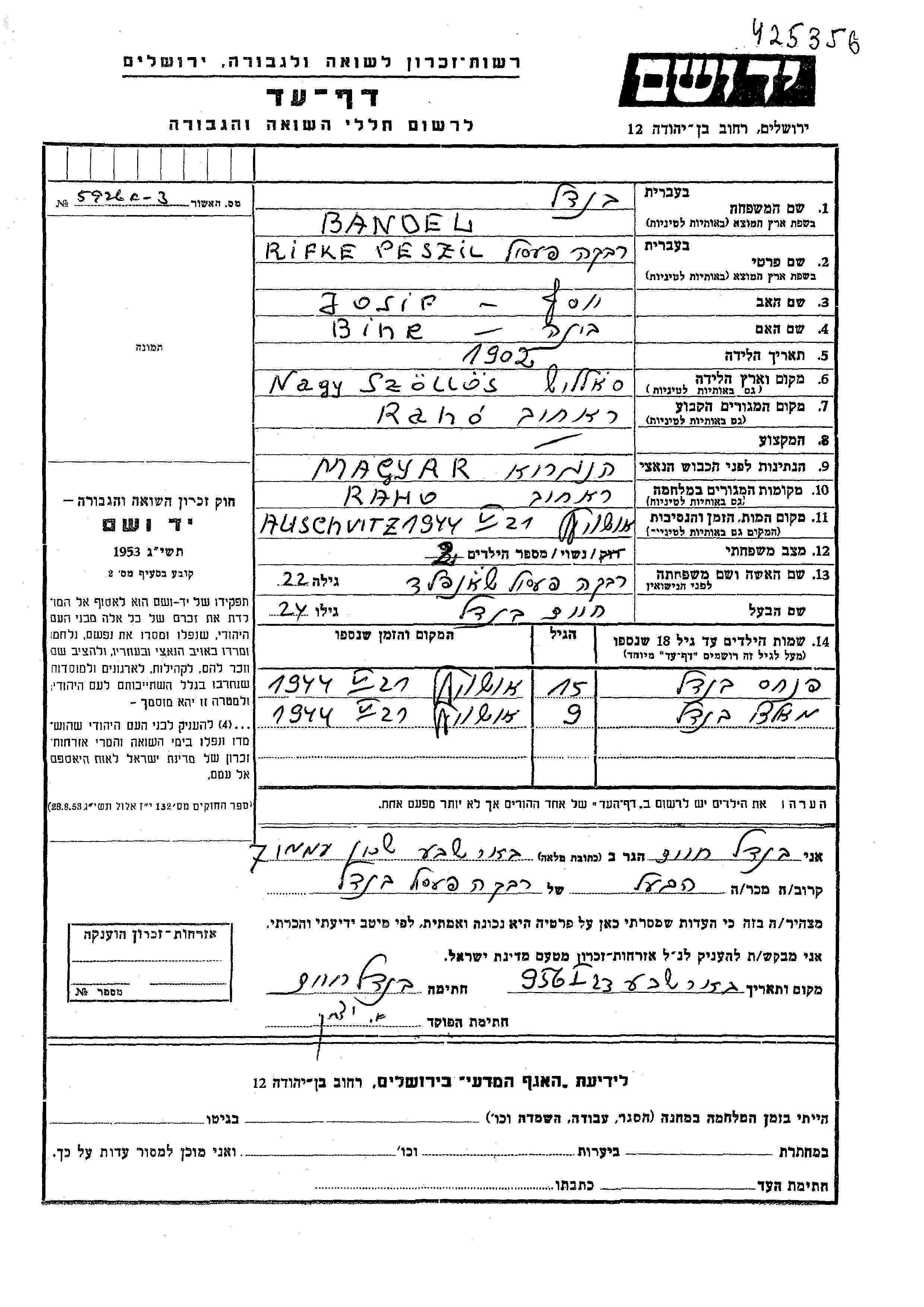 Malka Bandel wurde Sie war die Tochter von Khaim und Rifke Peszil, geb. Shonfeld. Sie war Kind. Vor dem Zweiten Weltkrieg lebte sie in Rahov, Tschechoslowakei. Während des Krieges war sie in Raho, Tschechoslowakei.