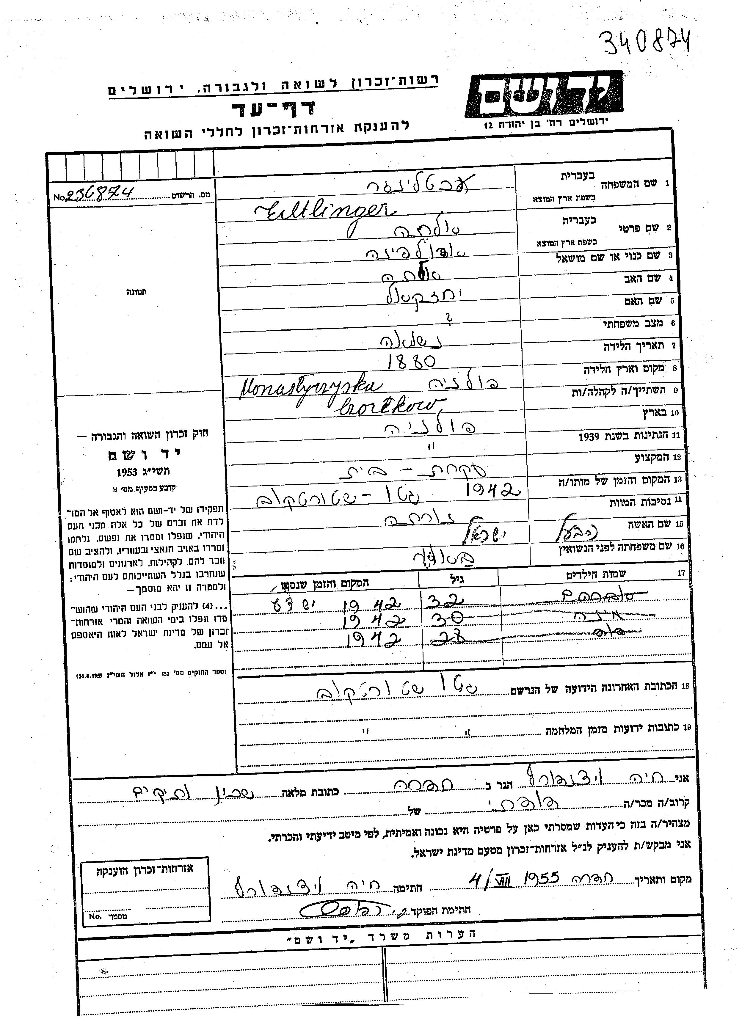 Mina Echtlinger wurde Er/sie war der/ die Sohn/Tochter von Yisrael und Alte Adolfine. Vor dem Zweiten Weltkrieg er/sie in Monasteryska, Polen. Während des Krieges war er/sie in Czortkow, Polen.