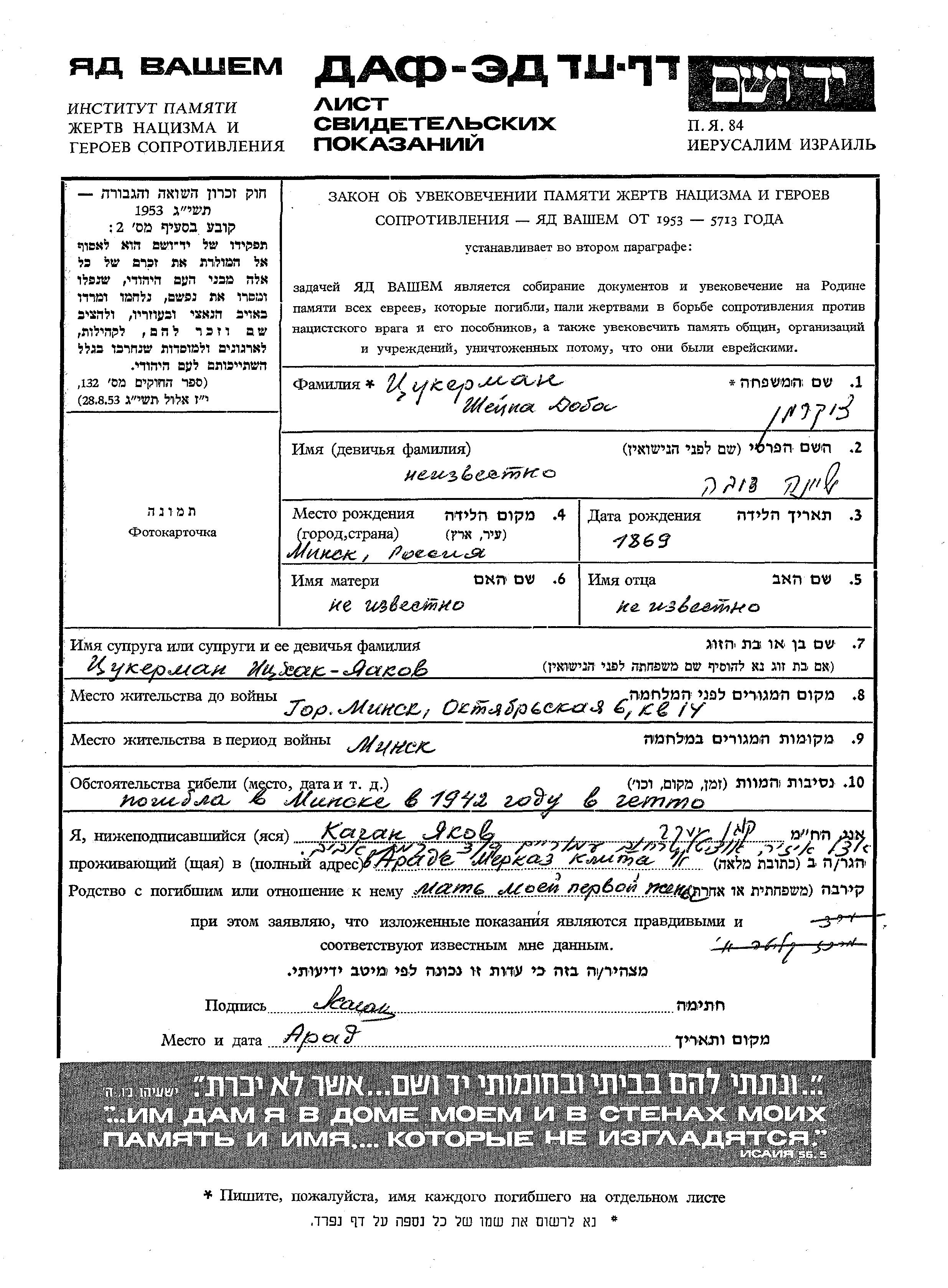 Doba Sheina Tzukerman wurde im Jahr 1869 in Minsk, Weißrussland (UdSSR) geboren. Sie war mit Itzhak Yaakov Verheiratet. Vor dem Zweiten Weltkrieg lebte sie in Minsk, Weißrussland (UdSSR). Während des Krieges war sie in Minsk, Weißrussland (UdSSR).