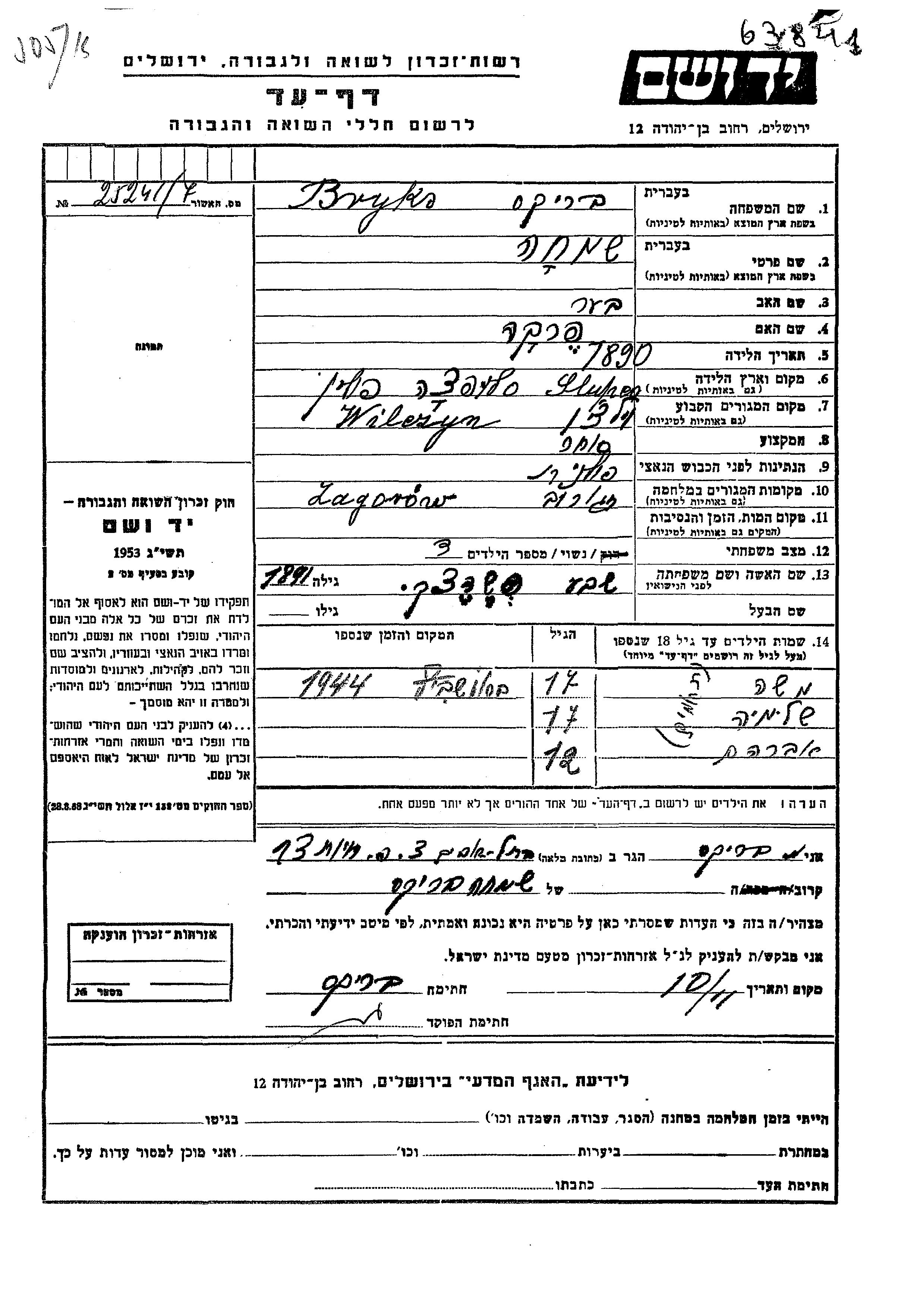 Shlomo Bryks wurde Er war der Sohn von Simkha und Sheva, geb. Pashdetzki. Er war Kind. Vor dem Zweiten Weltkrieg lebte er in Wilczyn, Polen. Während des Krieges war er in Zagorow, Polen.