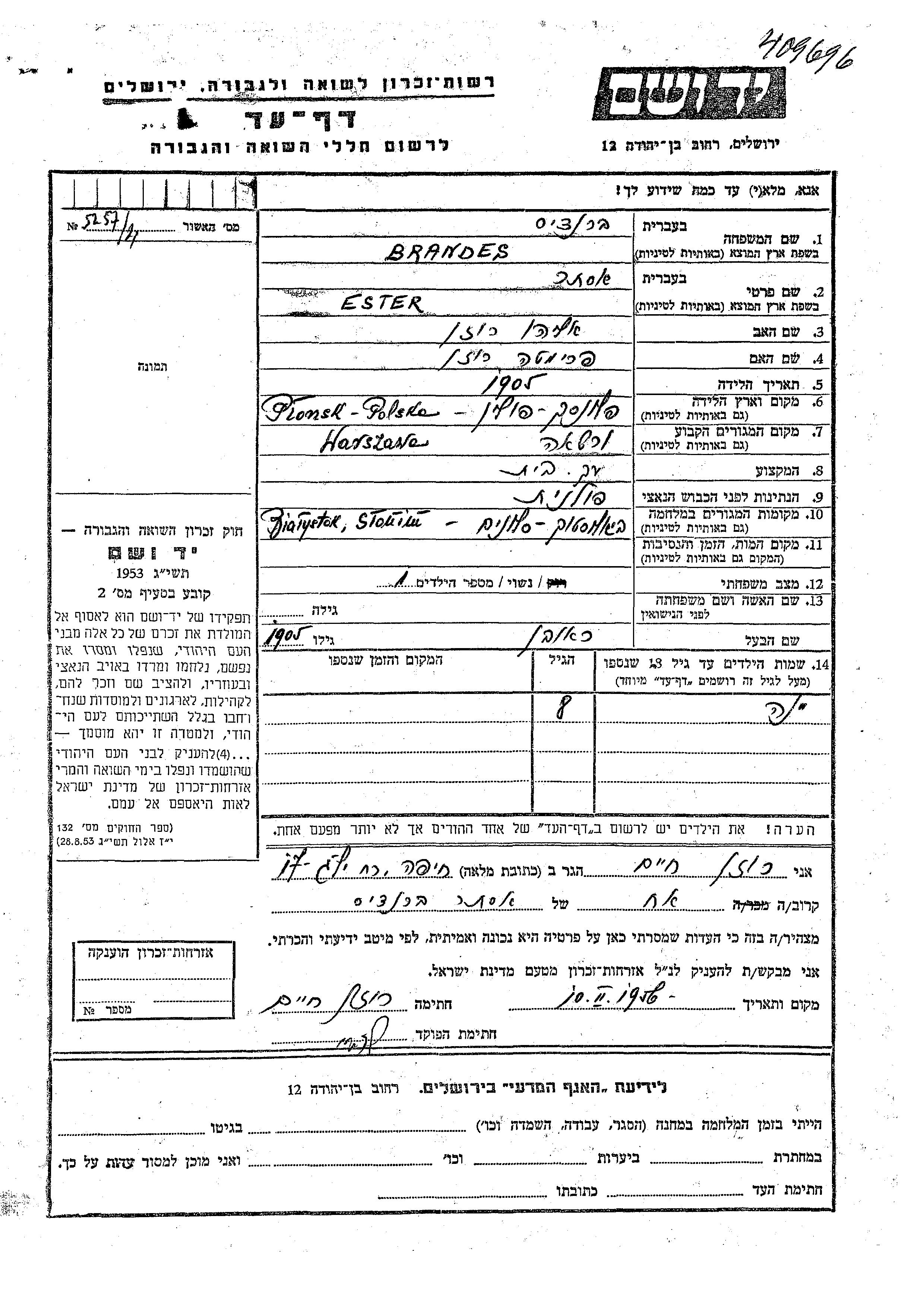 Yana Brandis wurde Sie war die Tochter von Reuven und Ester, geb. Rozen. Sie war Kind. Vor dem Zweiten Weltkrieg lebte sie in Warszawa, Polen. Während des Krieges war sie in Slonim, Polen.
