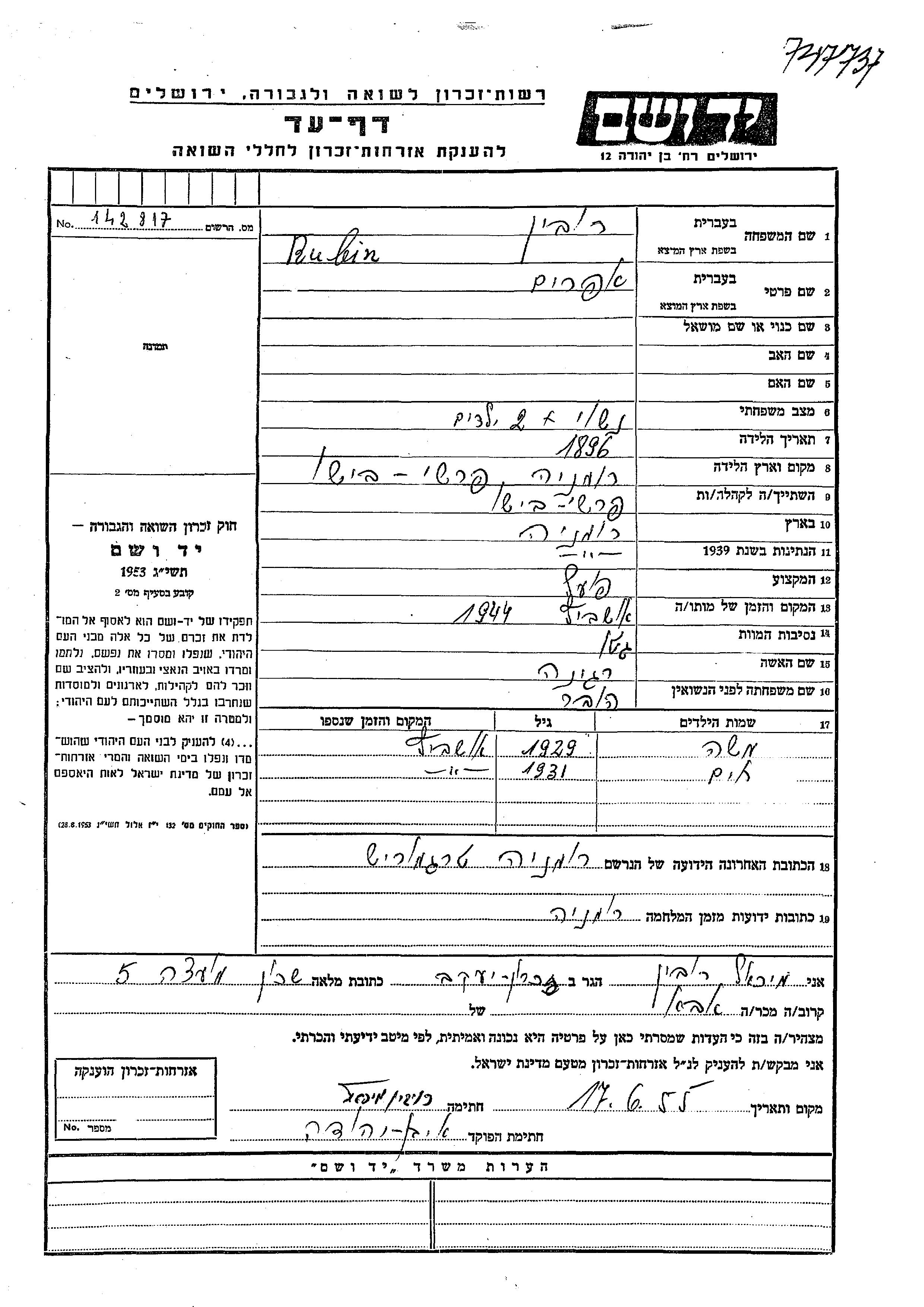 Khaim Rubin wurde im Jahr 1931 geboren. Er war der Sohn von Efraim und Regina, geb. Huber. Er war Kind. Vor dem Zweiten Weltkrieg lebte er in Felsoviso, Rumänien. Während des Krieges war er in Targu Mures, Rumänien.