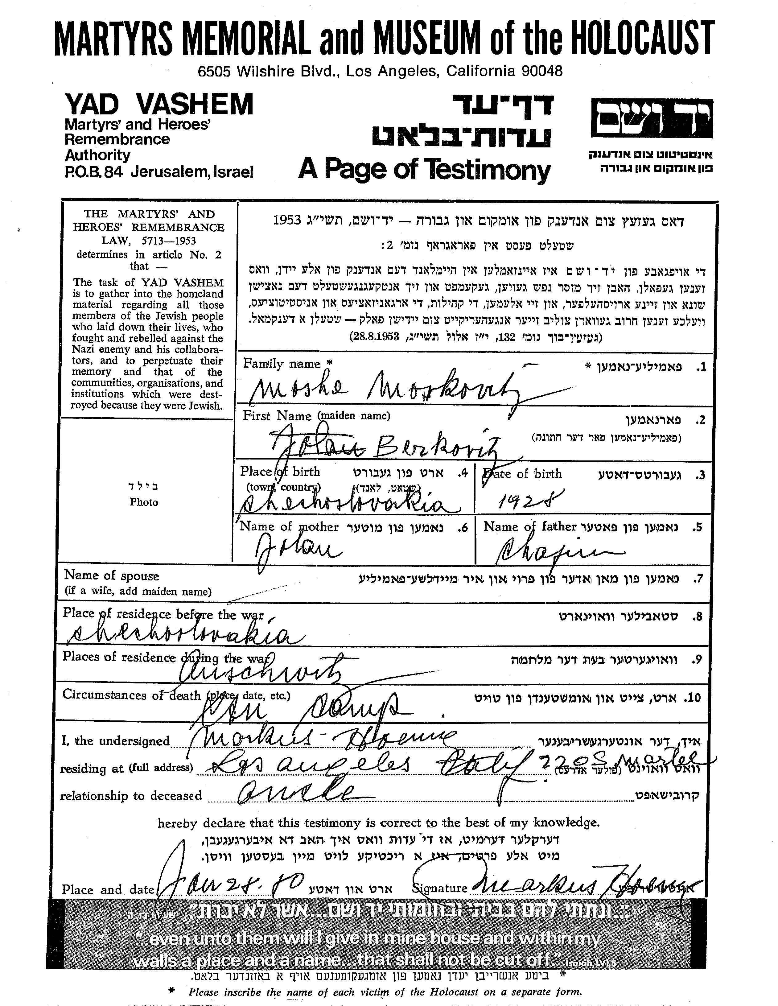 Moshe wurde in der Schoah ermordet. Todesort: Auschwitz, Polen.