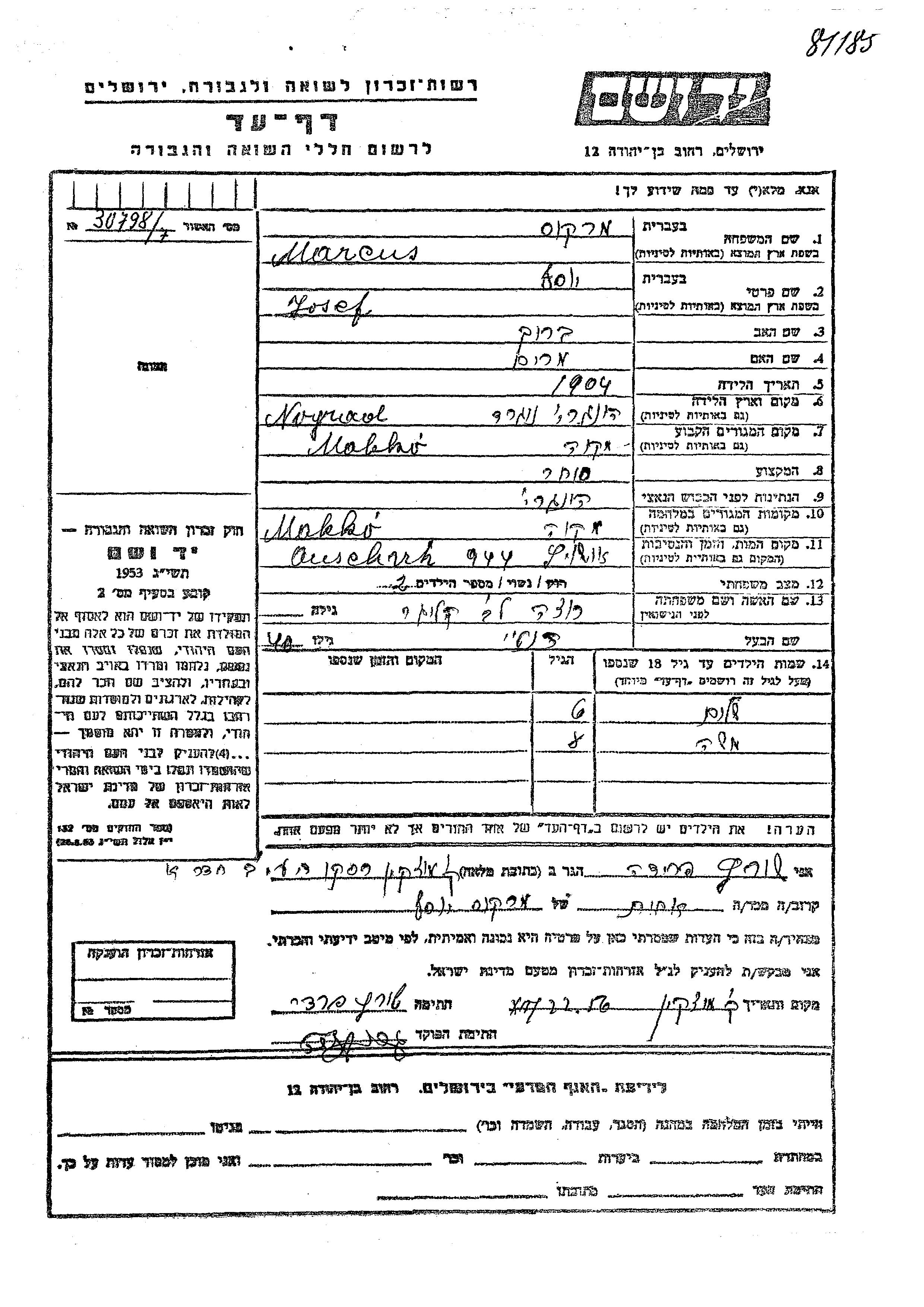 Shalom Marcus wurde Er war der Sohn von Josef und Roza, geb. Kliger. Er war Kind. Vor dem Zweiten Weltkrieg lebte er in Mako, Ungarn. Während des Krieges war er in Mako, Ungarn.