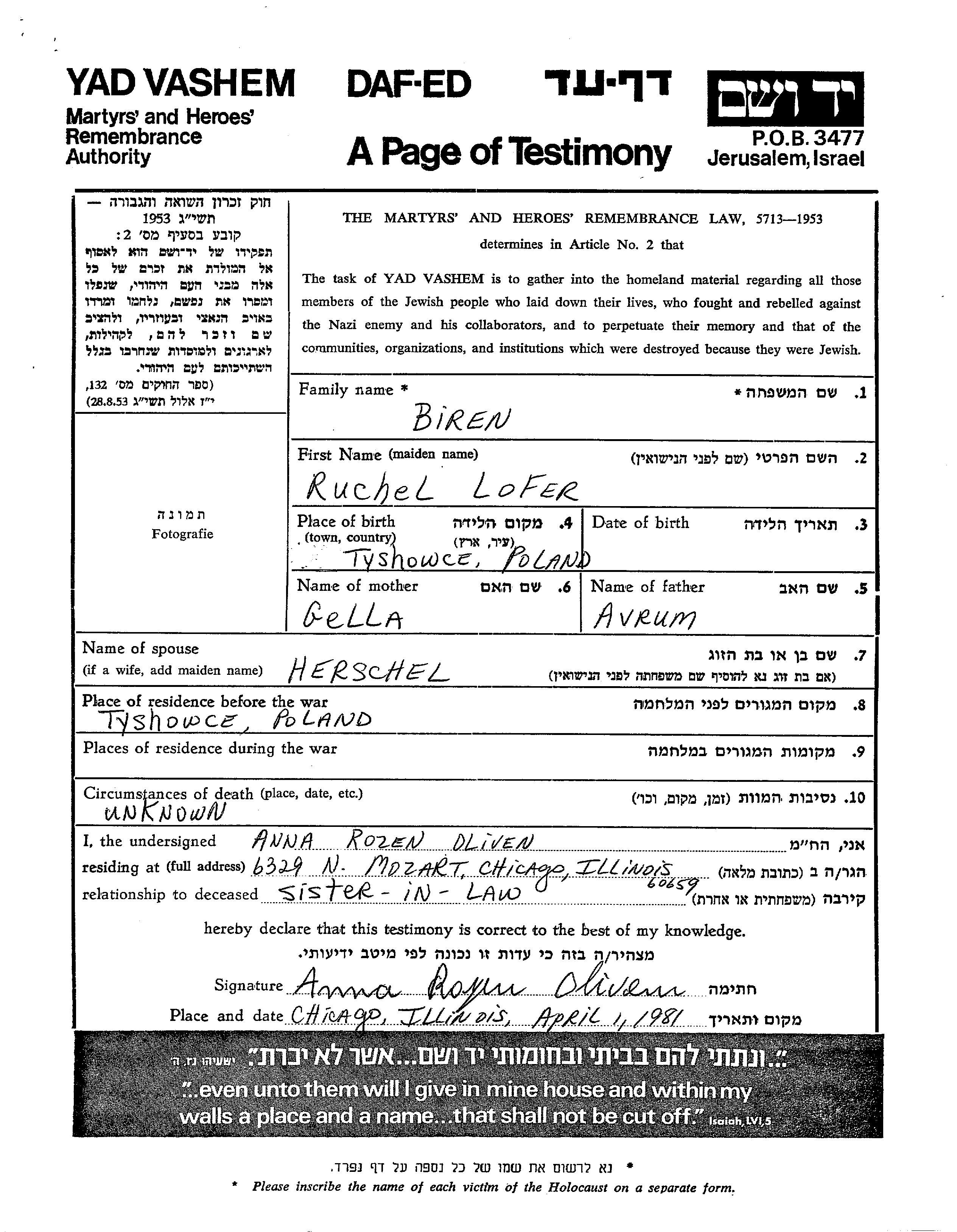 Ruchel Biren, geb. Lofer wurde in Tyszowce, Polen geboren. Sie war die Tochter von Avrum und Gella. Sie war mit Herschel Verheiratet. Vor dem Zweiten Weltkrieg lebte sie in Tyszowce, Polen.