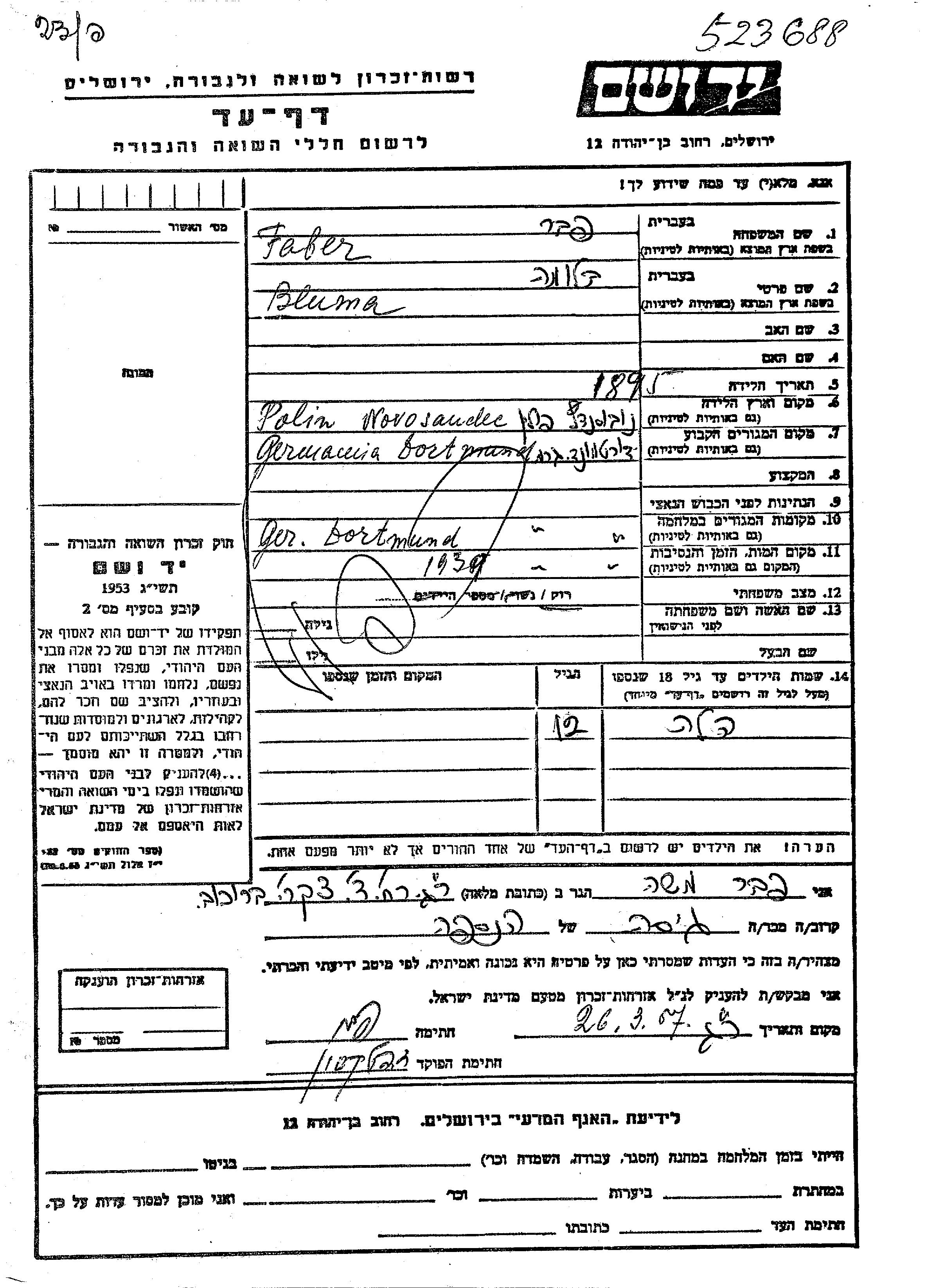 Bluma Faber wurde im Jahr 1895 in Nowi Sadz, Polen geboren. Sie war Ledig. Vor dem Zweiten Weltkrieg lebte sie in Dortmund, Deutsches Reich. Während des Krieges war sie in Dortmund, Deutsches Reich.