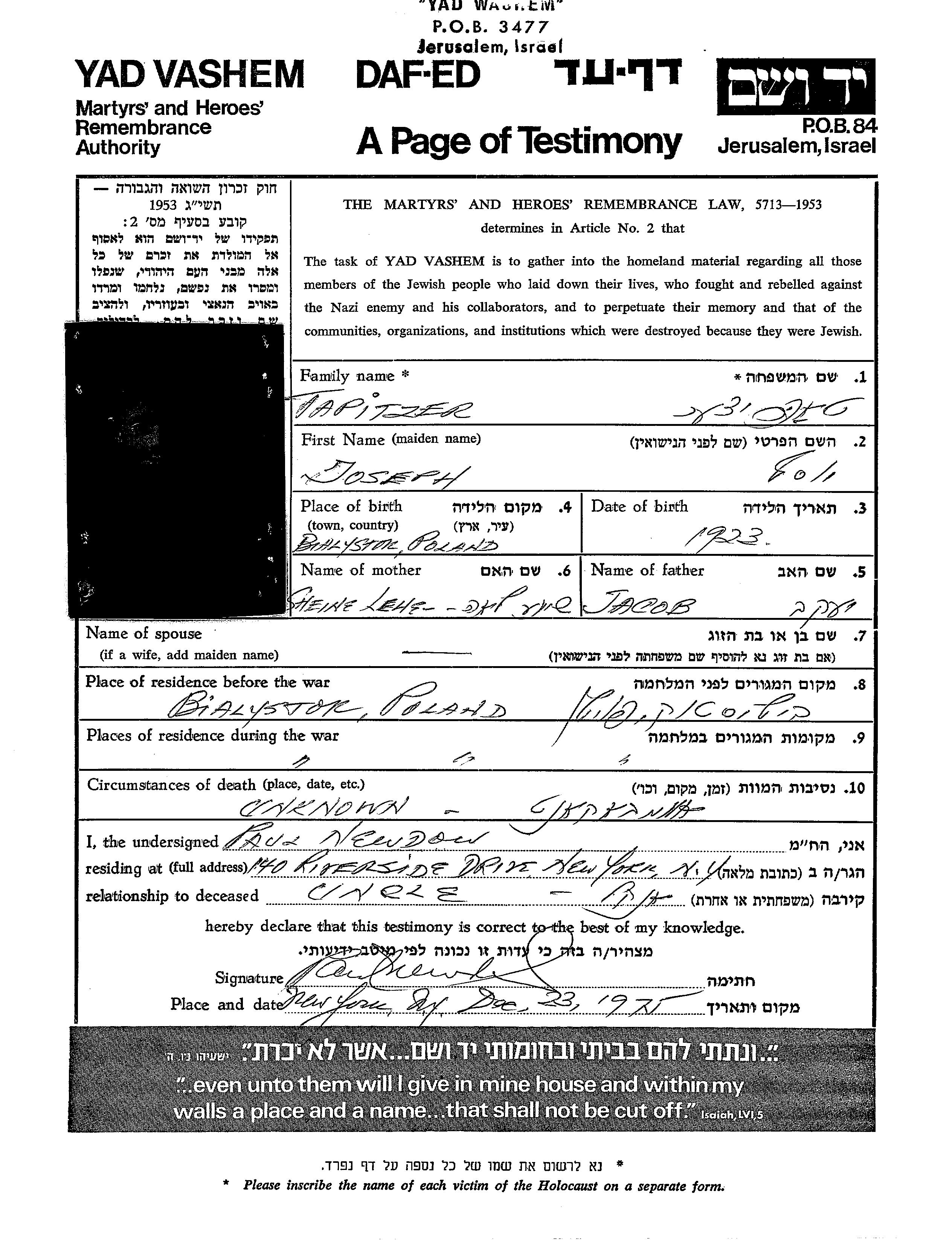 Joseph Tapitzer wurde im Jahr 1923 in Bialistok, Polen geboren. Er war der Sohn von Jacob und Sheine Lehe. Vor dem Zweiten Weltkrieg lebte er in Bialistok, Polen. Während des Krieges war er in Bialistok, Polen.