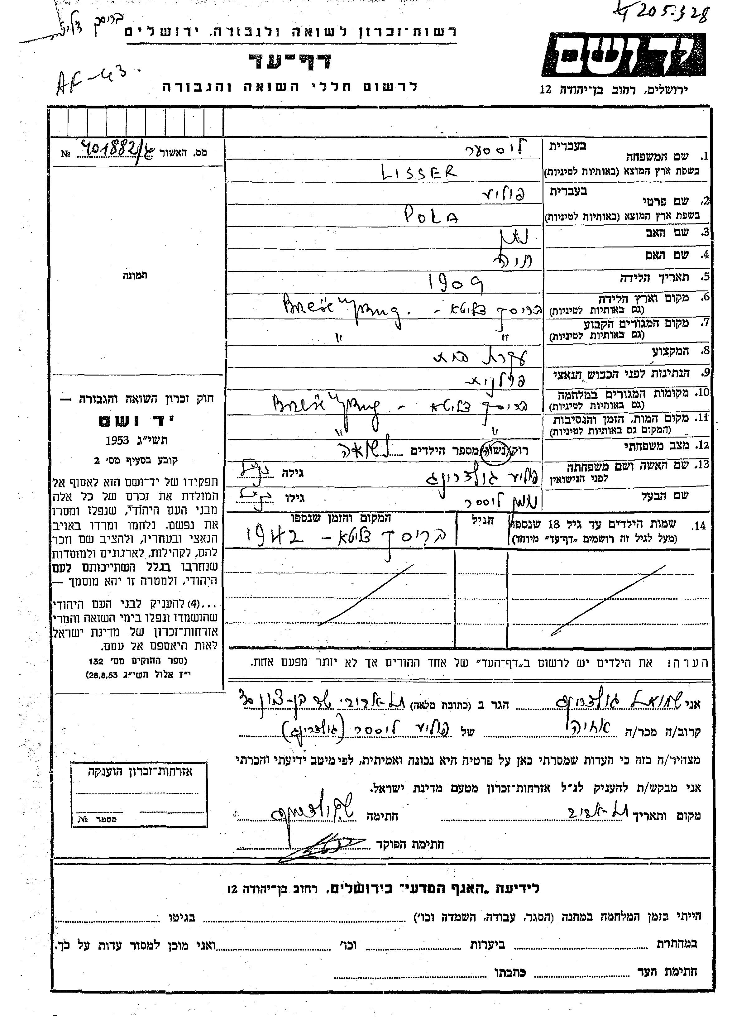 Pola Lisser, geb. Goldring wurde im Jahr 1909 in Brześć nad Bugiem, Polen geboren. Sie war die Tochter von Natan und Khaia. Sie war Hausfrau und mit Shimon Verheiratet. Vor dem Zweiten Weltkrieg lebte sie in Brześć nad Bugiem, Polen. Während des Krieges war sie in Brześć nad Bugiem, Polen.