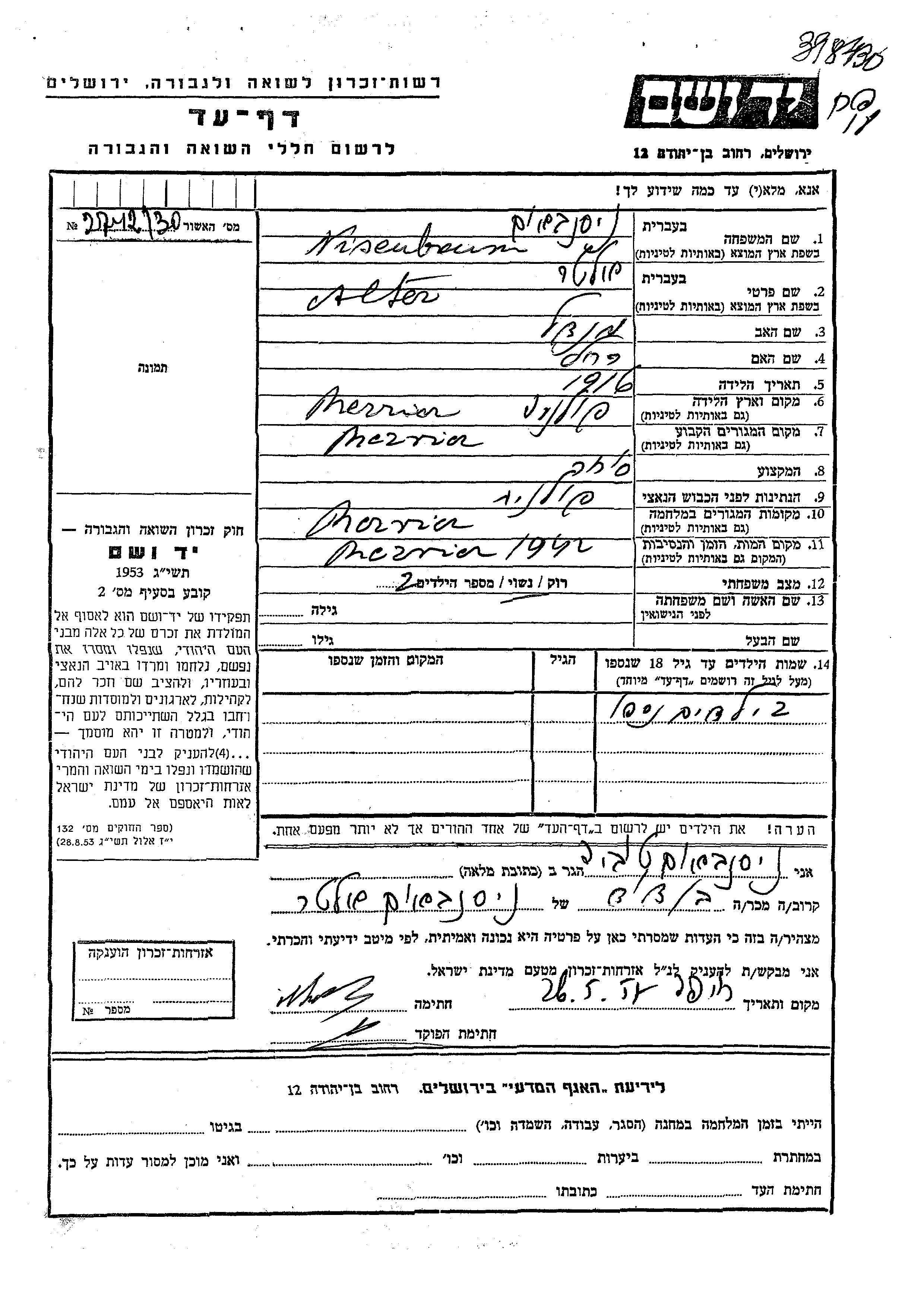 Alter Nisenbaum wurde im Jahr 1916 in Mezrich, Polen geboren. Er war der Sohn von Mendel und Rakhel. Er war Kaufmann/-frau und Verheiratet. Vor dem Zweiten Weltkrieg lebte er in Mezrich, Polen. Während des Krieges war er in Mezrich, Polen.