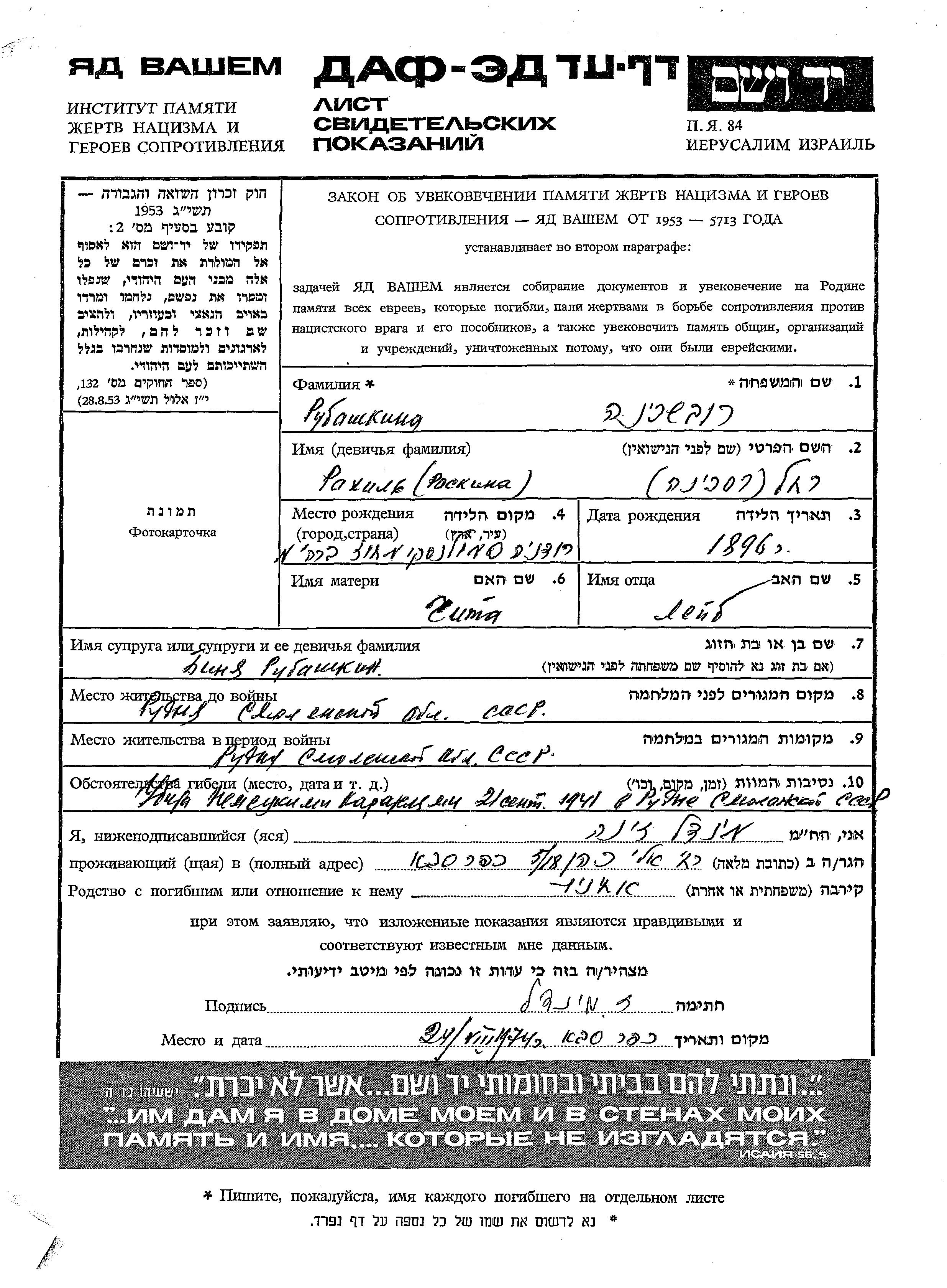Rakhil wurde in der Schoah ermordet. Todesort: Rudnya, Russland (UdSSR) im Jahr 21/09/1941.