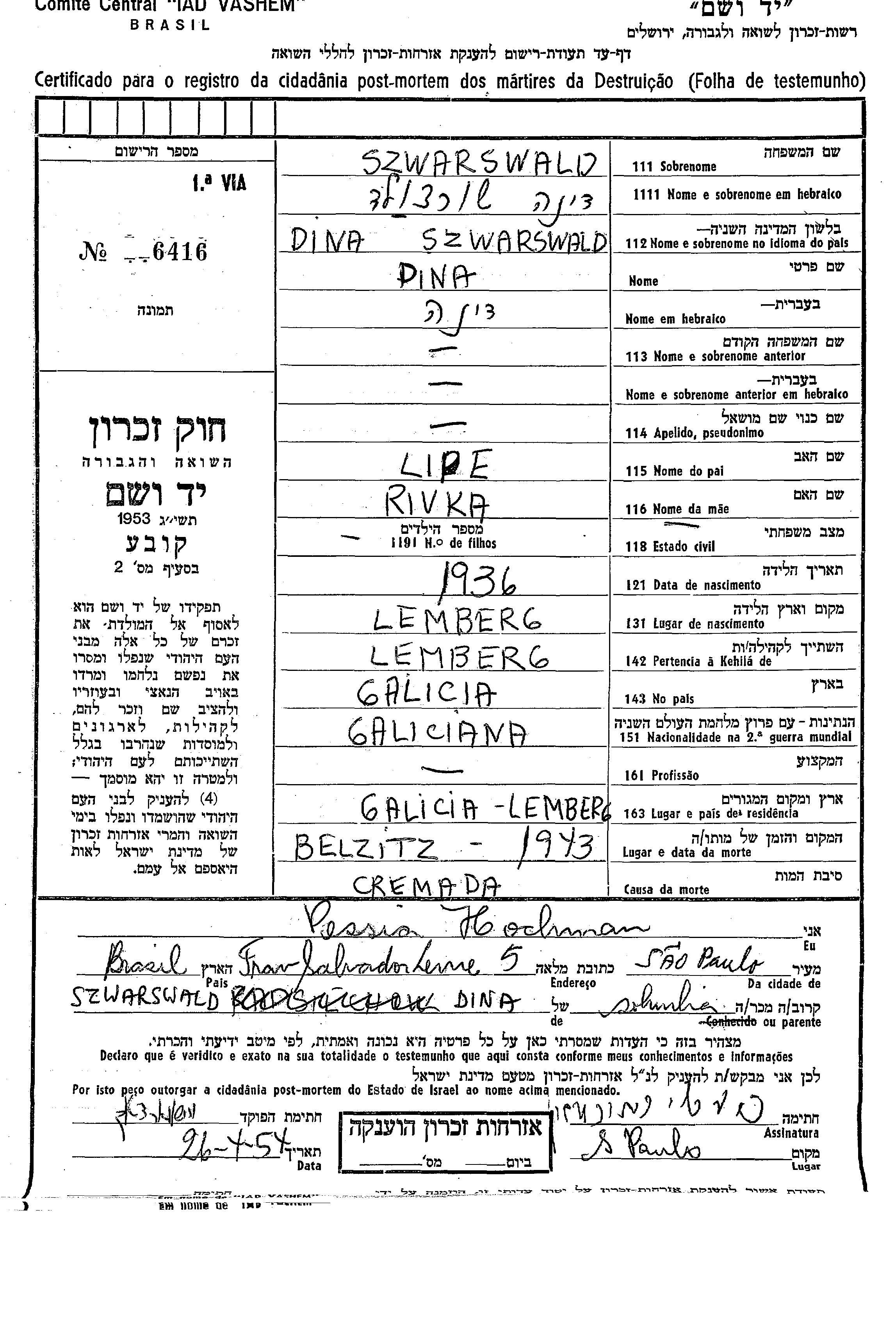 Dina Szwarswald wurde im Jahr 1936 in Lemberg, Polen geboren. Sie war die Tochter von Lipe und Rivka. Vor dem Zweiten Weltkrieg lebte sie in Lemberg, Polen. Während des Krieges war sie in Galizien Region, Polen.