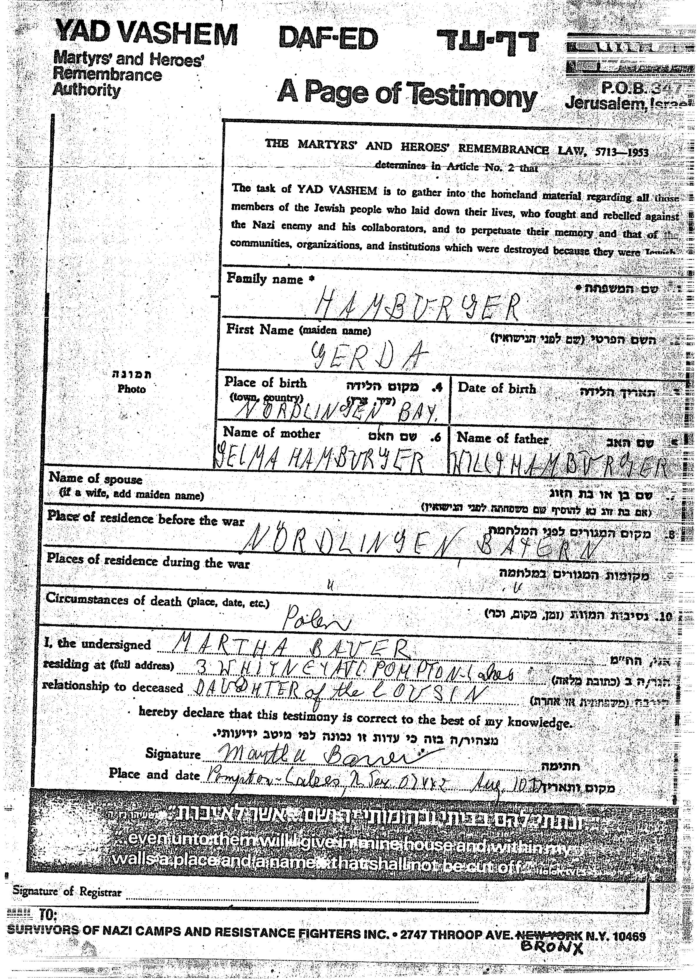 Gerda Hamburger wurde in Noerdlingen, Deutsches Reich geboren. Sie war die Tochter von Willi und Selma. Vor dem Zweiten Weltkrieg lebte sie in Noerdlingen, Deutsches Reich. Während des Krieges war sie in Noerdlingen, Deutsches Reich.