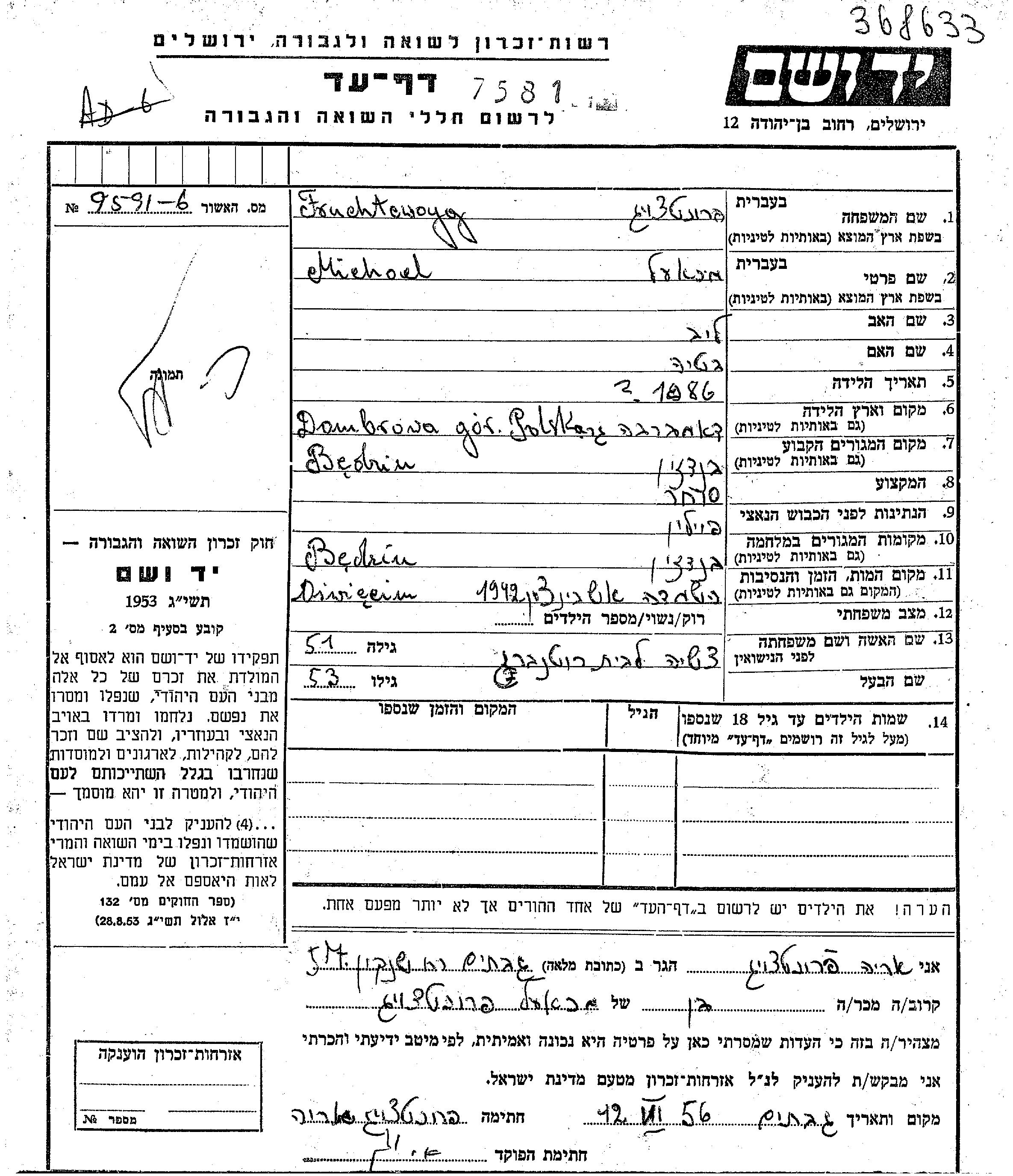 Michael Fruchtcwajg wurde im Jahr 1886 in Dombrowa Gornicza, Polen geboren. Er war der Sohn von Leib und Batia. Er war Kaufmann/-frau und mit Cesia, geb. Rutenberg Verheiratet. Vor dem Zweiten Weltkrieg lebte er in Będzin, Polen. Während des Krieges war er in Będzin, Polen.