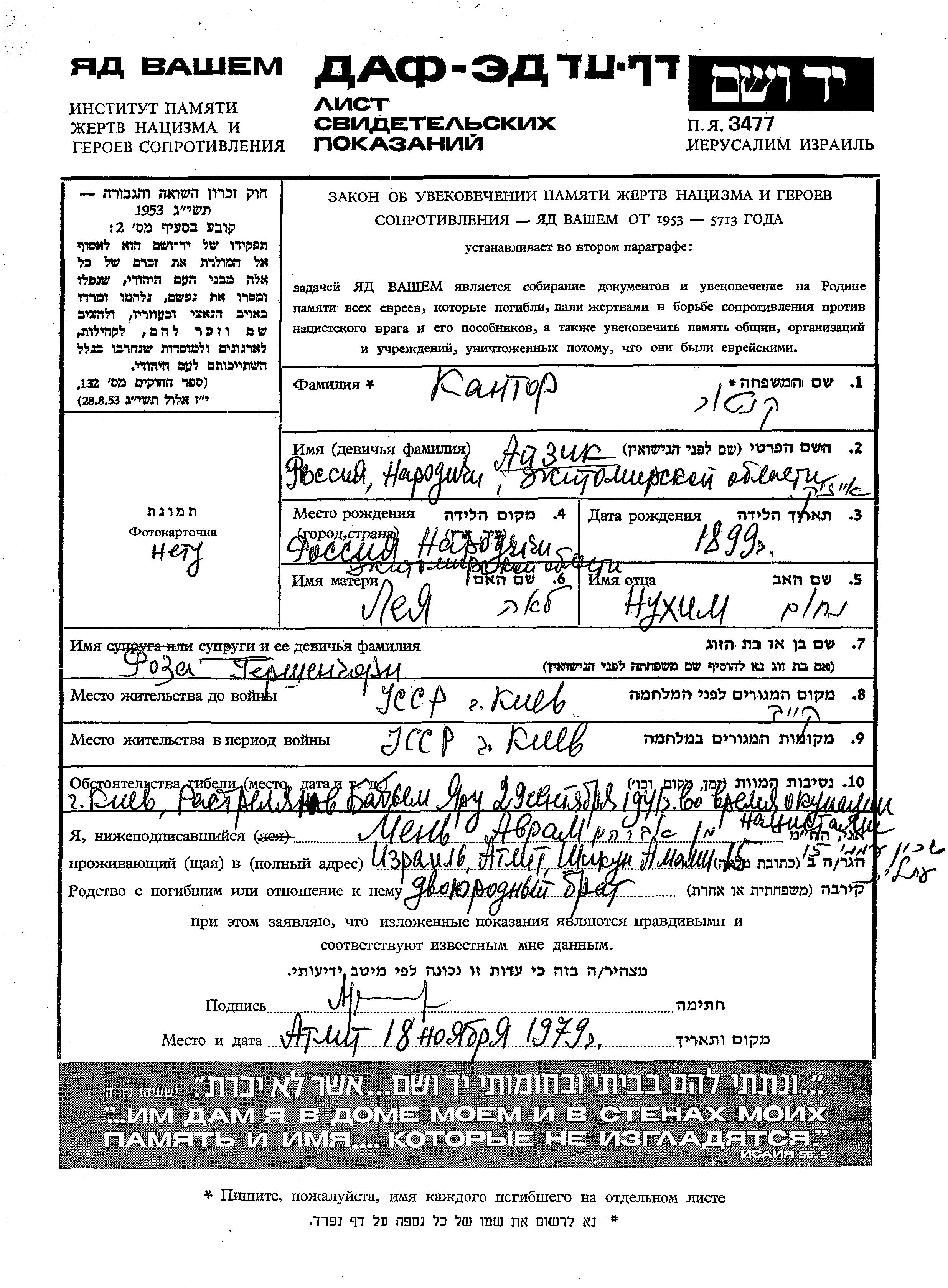 Aizik Kantor wurde im Jahr 1899 in Narodichi, Ukraine (UdSSR) geboren. Er war der Sohn von Nukhim und Leya. Er war mit Roza, geb. Gershengorn Verheiratet. Vor dem Zweiten Weltkrieg lebte er in Kiev, Ukraine (UdSSR). Während des Krieges war er in Kiev, Ukraine (UdSSR).