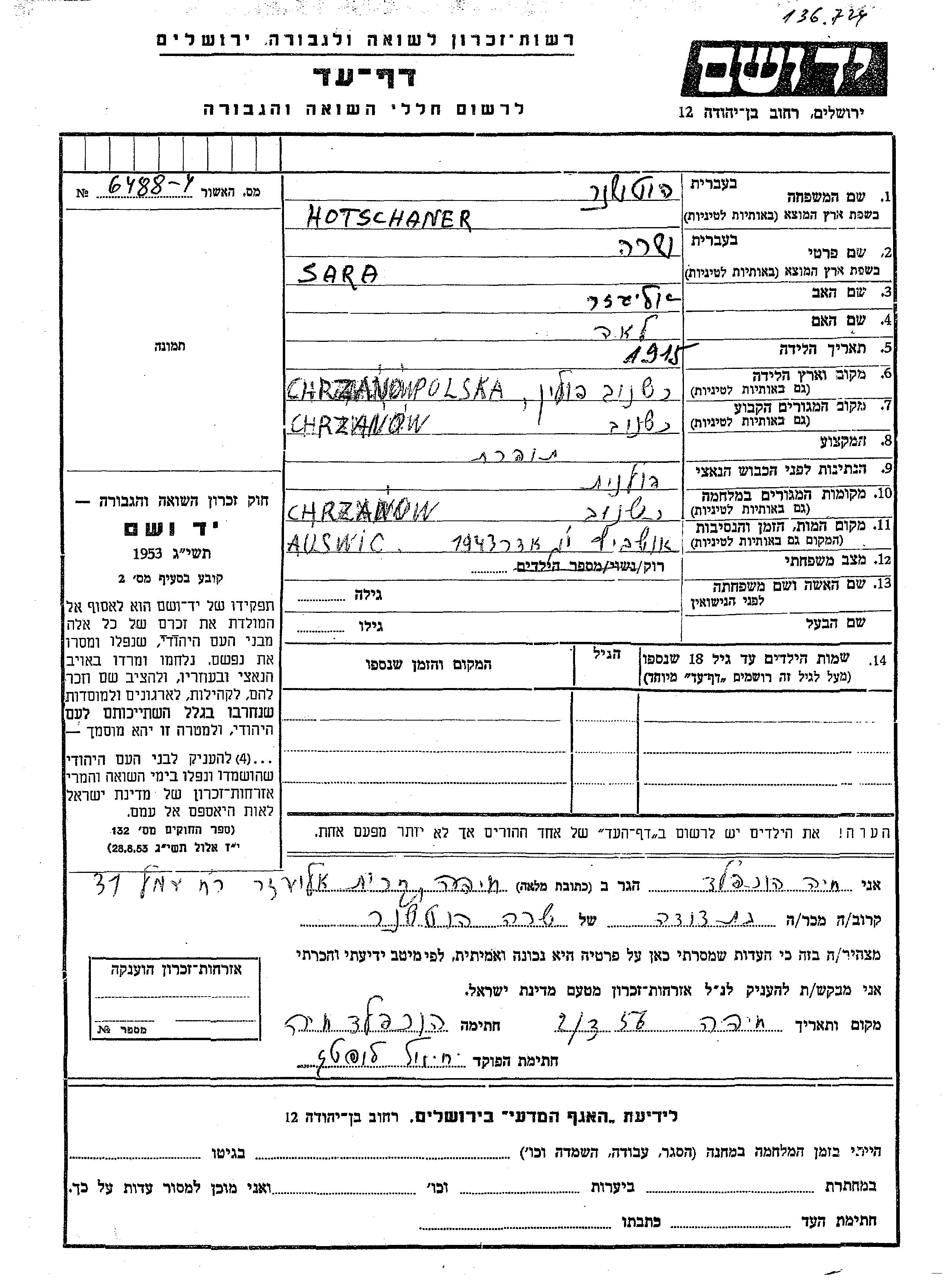 Sara Hotschaner wurde im Jahr 1915 in Chrzanow, Polen geboren. Sie war die Tochter von Eliezer und Lea. Sie war Schneiderin und Ledig. Vor dem Zweiten Weltkrieg lebte sie in Chrzanow, Polen. Während des Krieges war sie in Chrzanow, Polen.