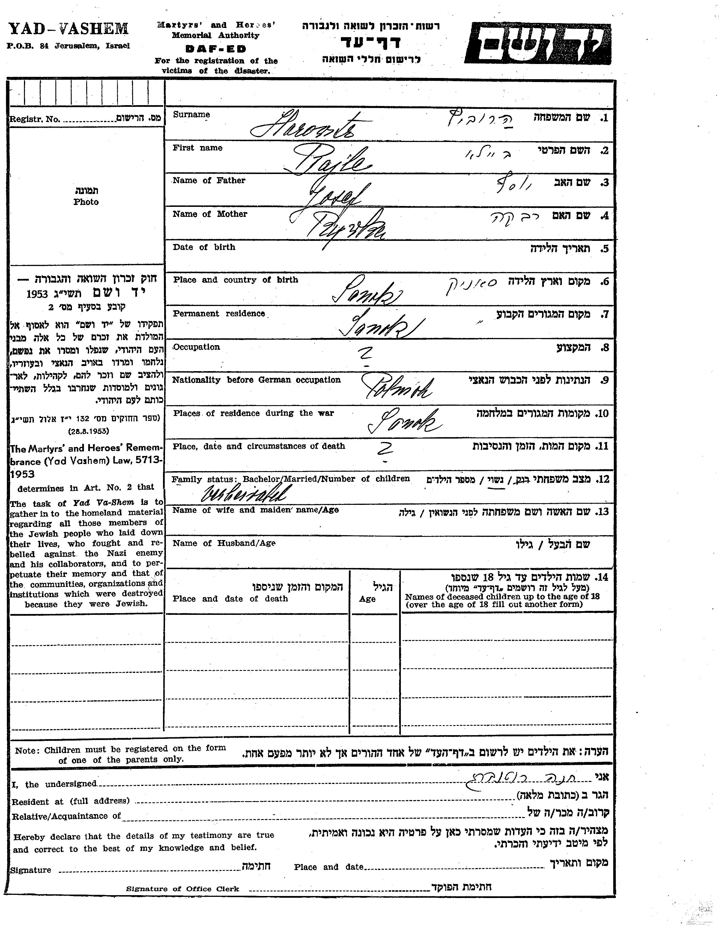 Bajle Harovits wurde in Sanok, Polen geboren. Sie war die Tochter von Yosef und Ryvka. Sie war Verheiratet. Vor dem Zweiten Weltkrieg lebte sie in Sanok, Polen. Während des Krieges war sie in Sanok, Polen.