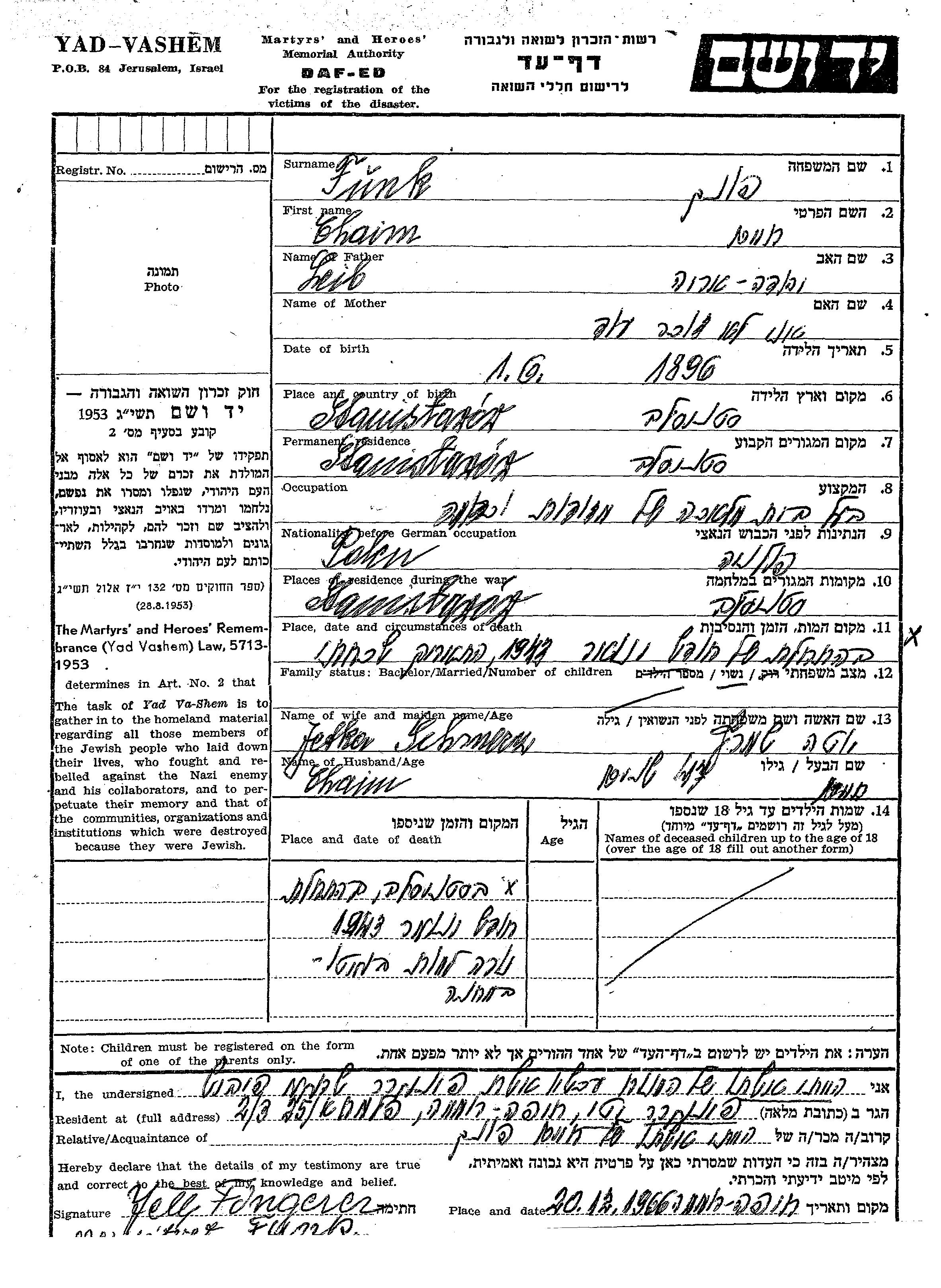 Chaim wurde in der Schoah ermordet. Todesort: unbekannt im Jahr 01/1943.