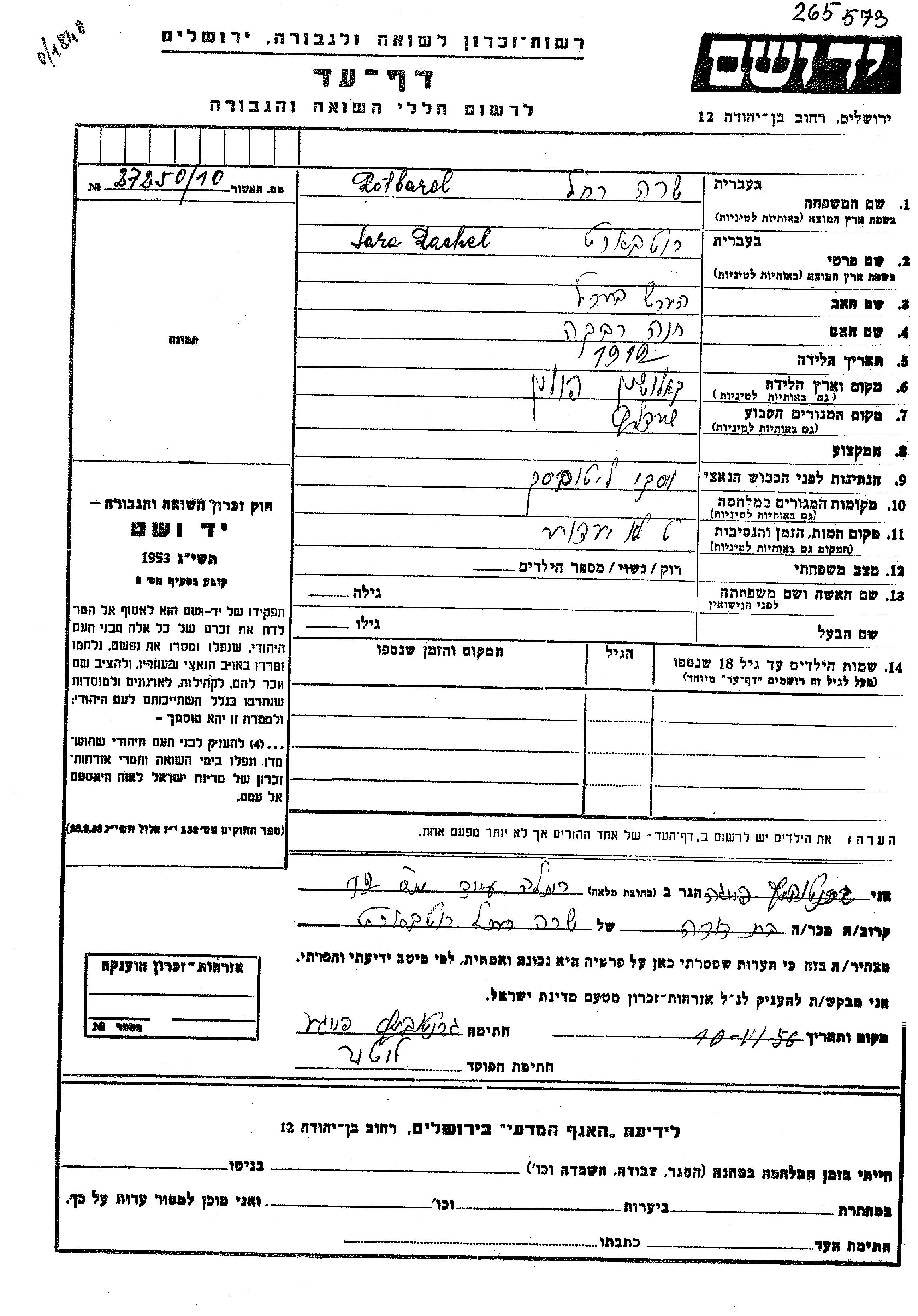 Rotbard Rachel Sara 1912 Siedlce, Polen Gedenkblatt