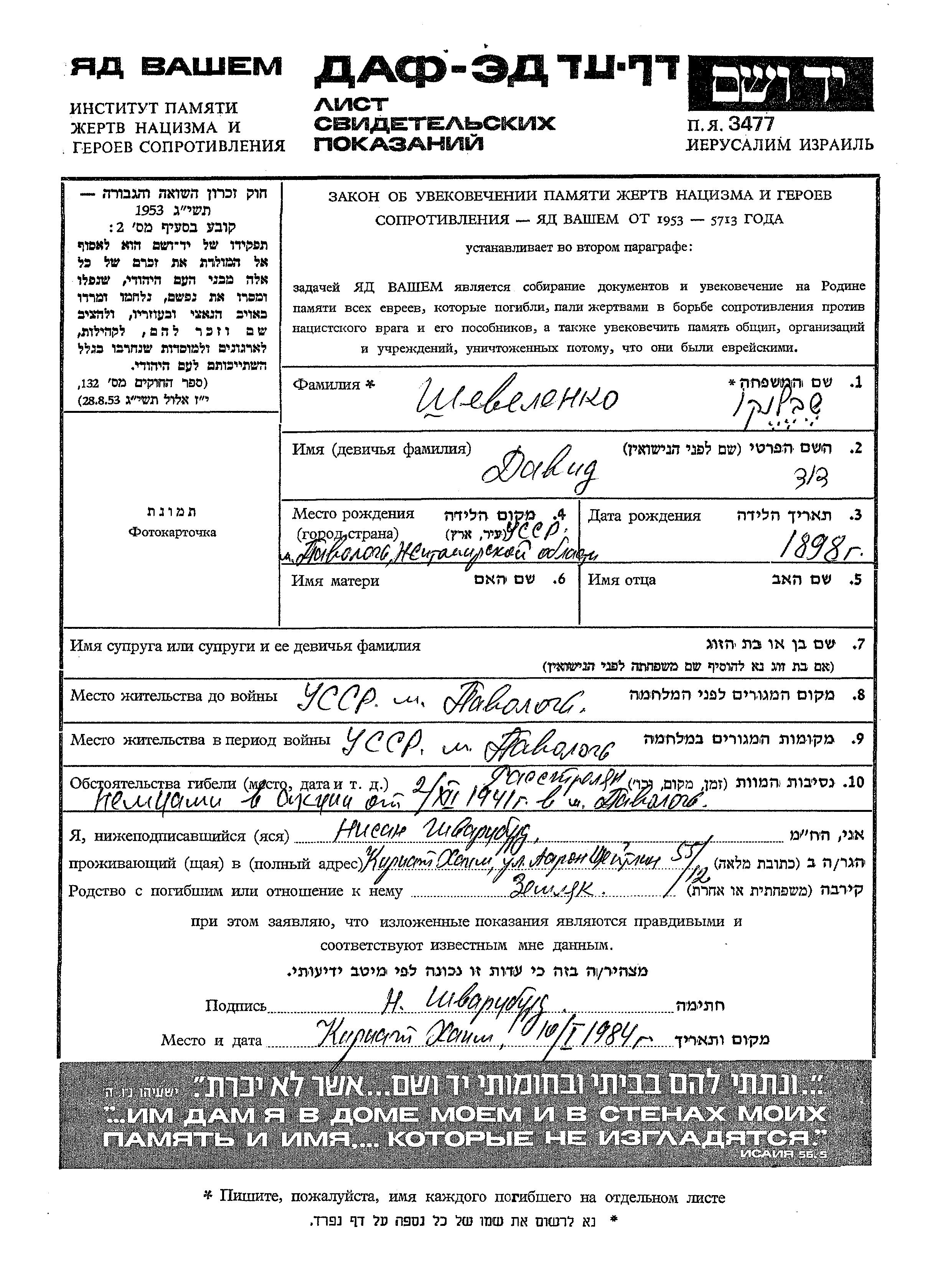 Shevelenko David 1898 Pavoloch, Ukraine (UdSSR) Gedenkblatt