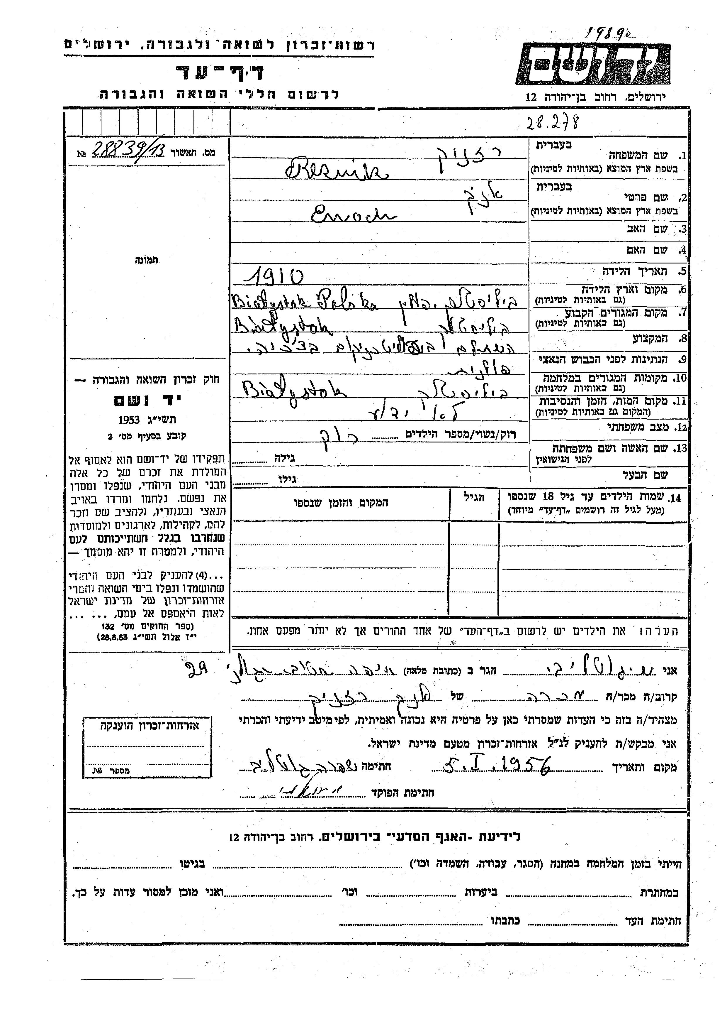 Enoch Reznik wurde im Jahr 1910 in Bialystok, Polen geboren. Er war Ledig. Vor dem Zweiten Weltkrieg lebte er in Bialystok, Polen. Während des Krieges war er in Bialystok, Polen.