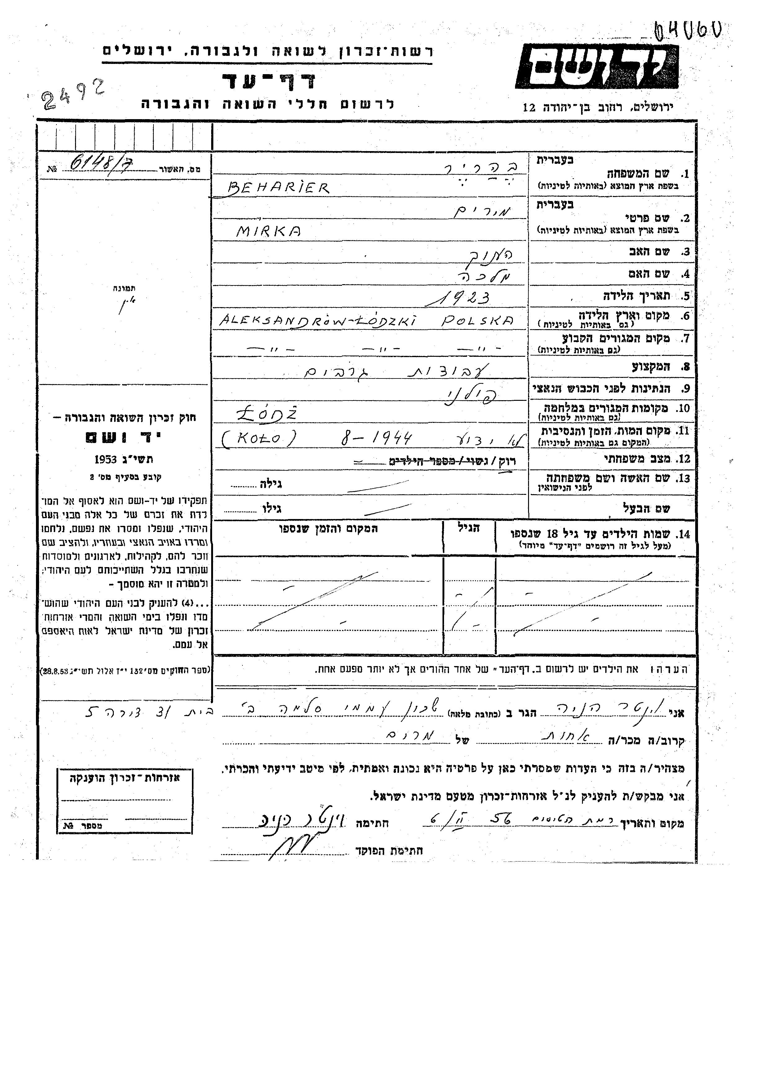 Mirka Miriam Beharier wurde im Jahr 1923 in Aleksandrow Lodzki, Polen geboren. Sie war die Tochter von Henik und Malka. Sie war Ledig. Vor dem Zweiten Weltkrieg lebte sie in Aleksandrow Lodzki, Polen. Während des Krieges war sie in Lodz, Polen.
