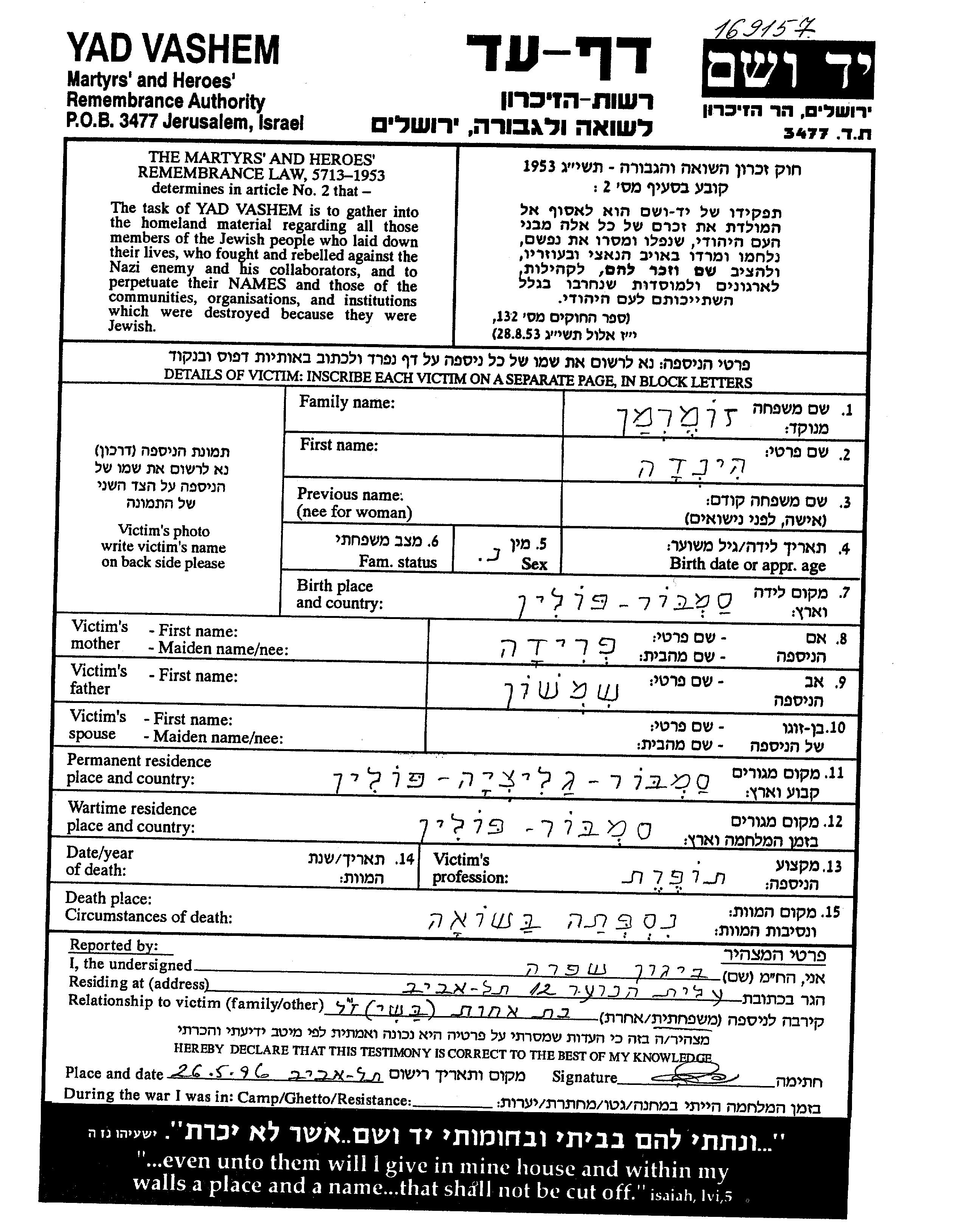 Zomerman Hinda Sambor, Polen Gedenkblatt