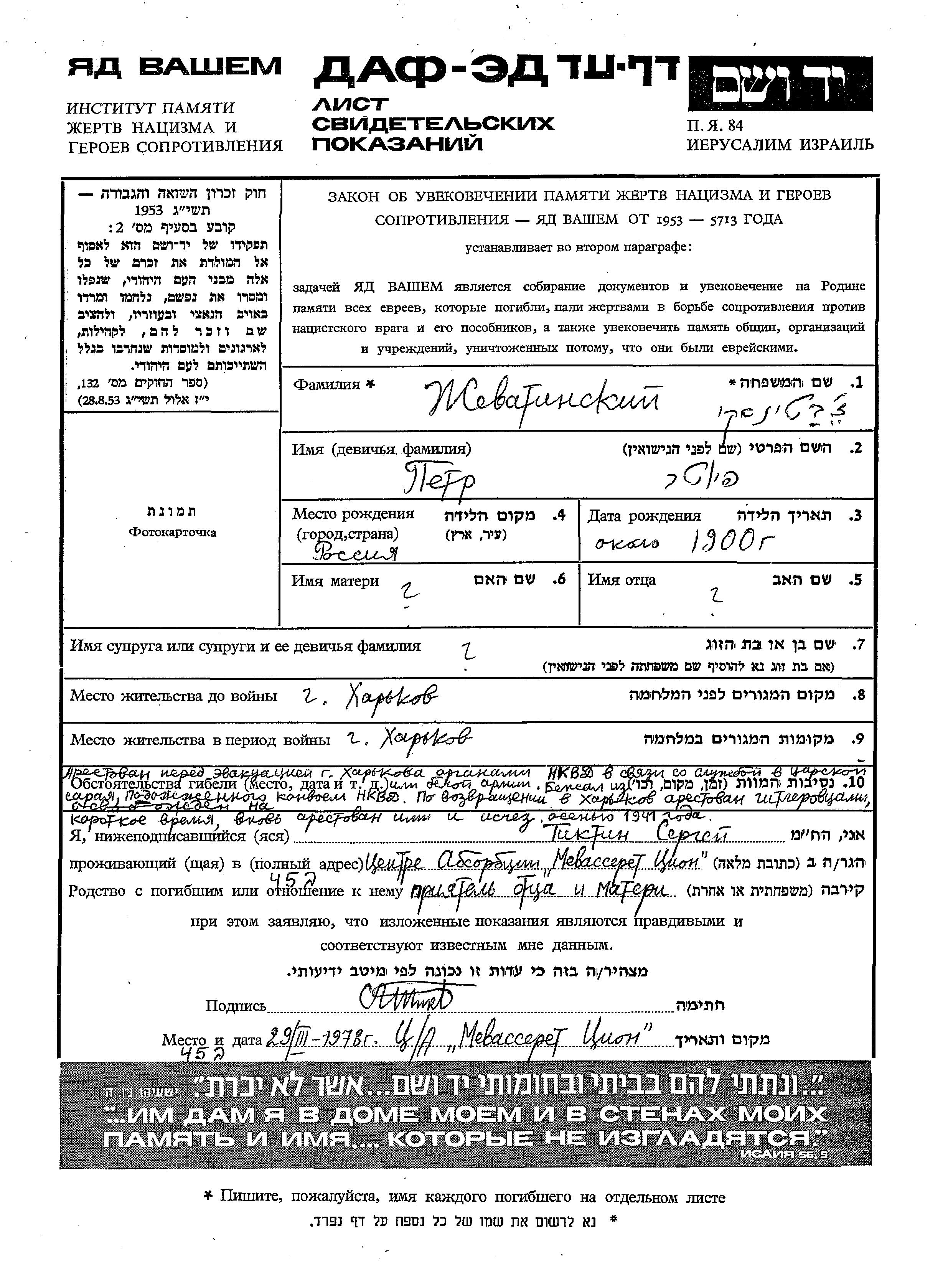 Petr wurde in der Schoah ermordet. Todesort: Kharkov, Ukraine (UdSSR) im Jahr 1941.
