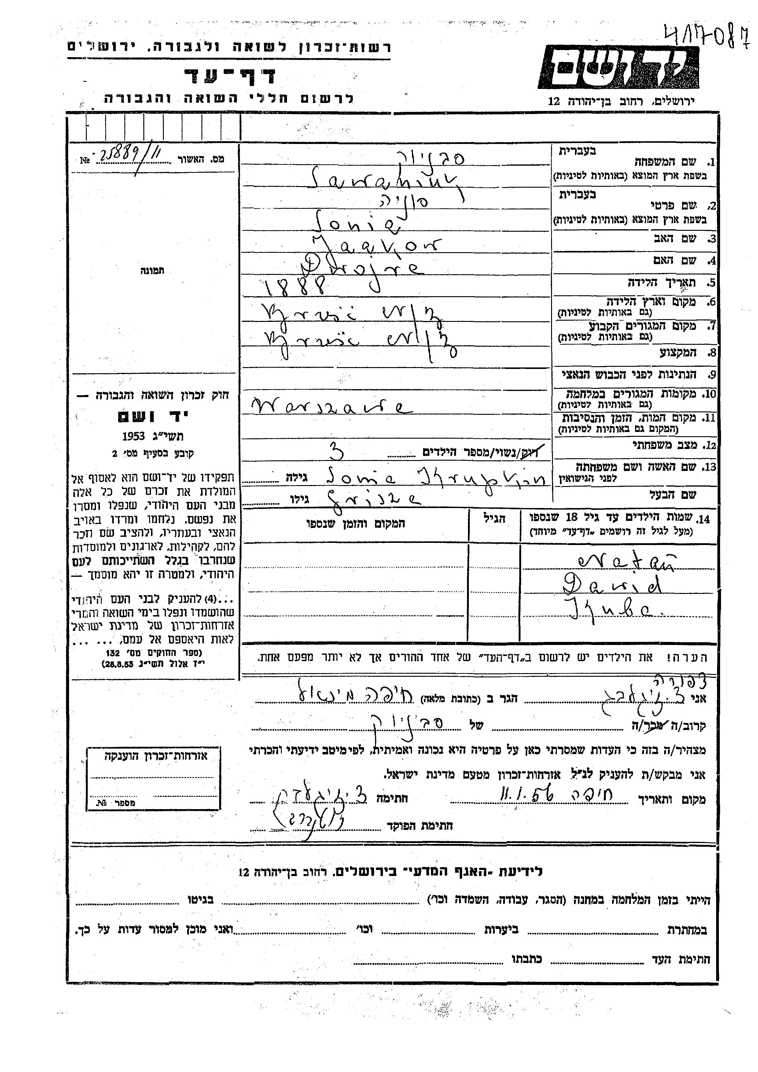 Sonia Sawaniuk Sabaniek, geb. Krupkin wurde im Jahr 1888 in Brisk, Polen geboren. Sie war die Tochter von Jaakow und Dwojre. Sie war mit Grisza Verheiratet. Vor dem Zweiten Weltkrieg lebte sie in Brisk, Polen. Während des Krieges war sie in Warszawa, Polen.