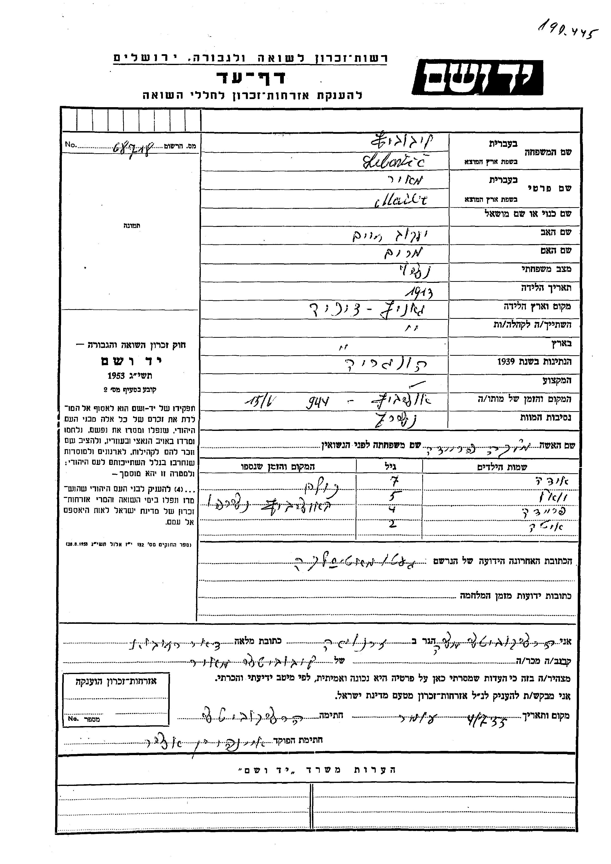 Maier Libovic wurde im Jahr 1913 in Ganice, Tschechoslowakei geboren. Er war der Sohn von Yaakov Khaim und Miriam. Er war mit Malka Freida Verheiratet.