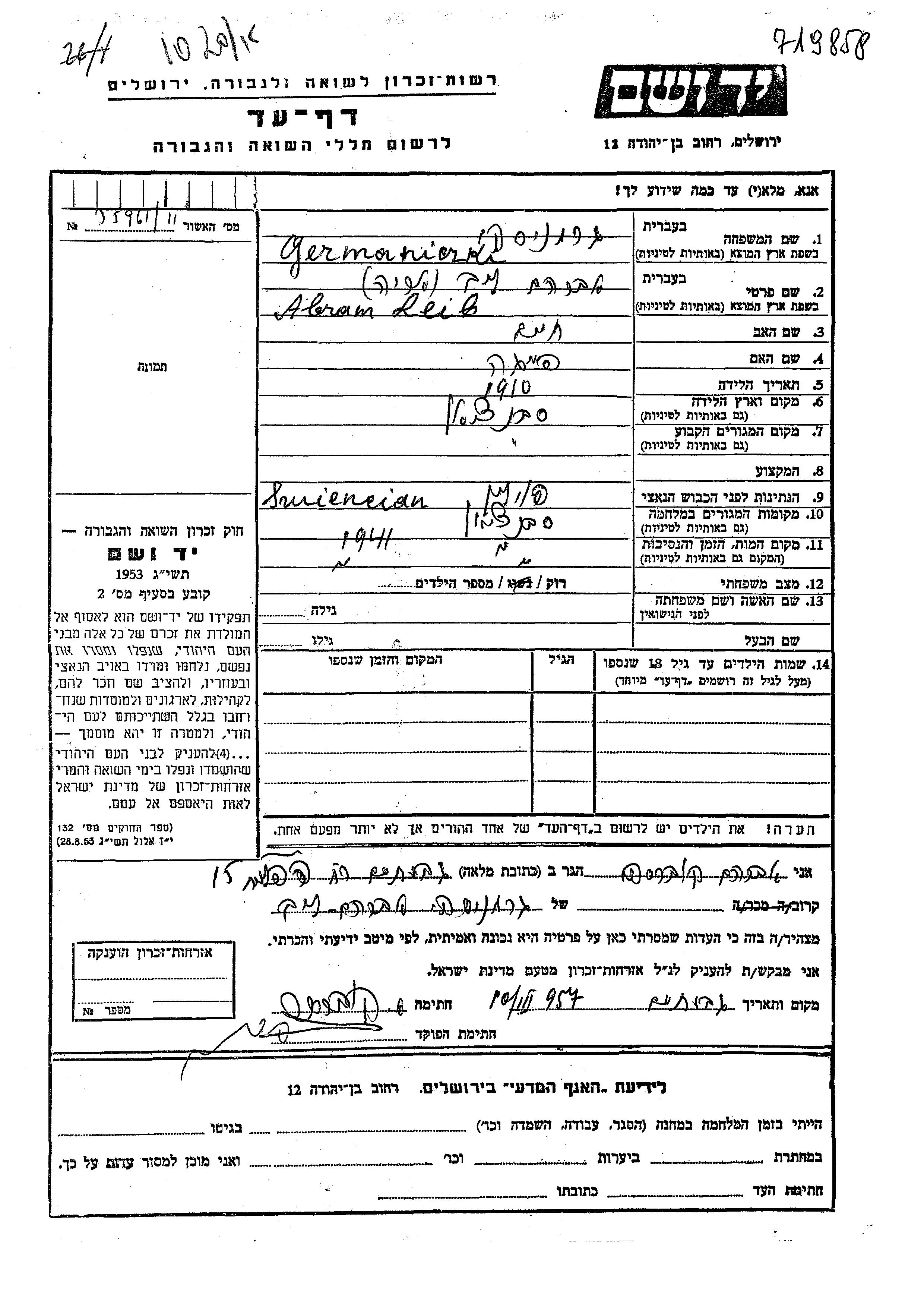 Abram Leib Arie Germaniczki Germaniski wurde im Jahr 1910 in Swieciany, Polen geboren. Er war der Sohn von Khaim und Feiga. Er war Ledig. Vor dem Zweiten Weltkrieg lebte er in Swieciany, Polen. Während des Krieges war er in Swieciany, Polen.