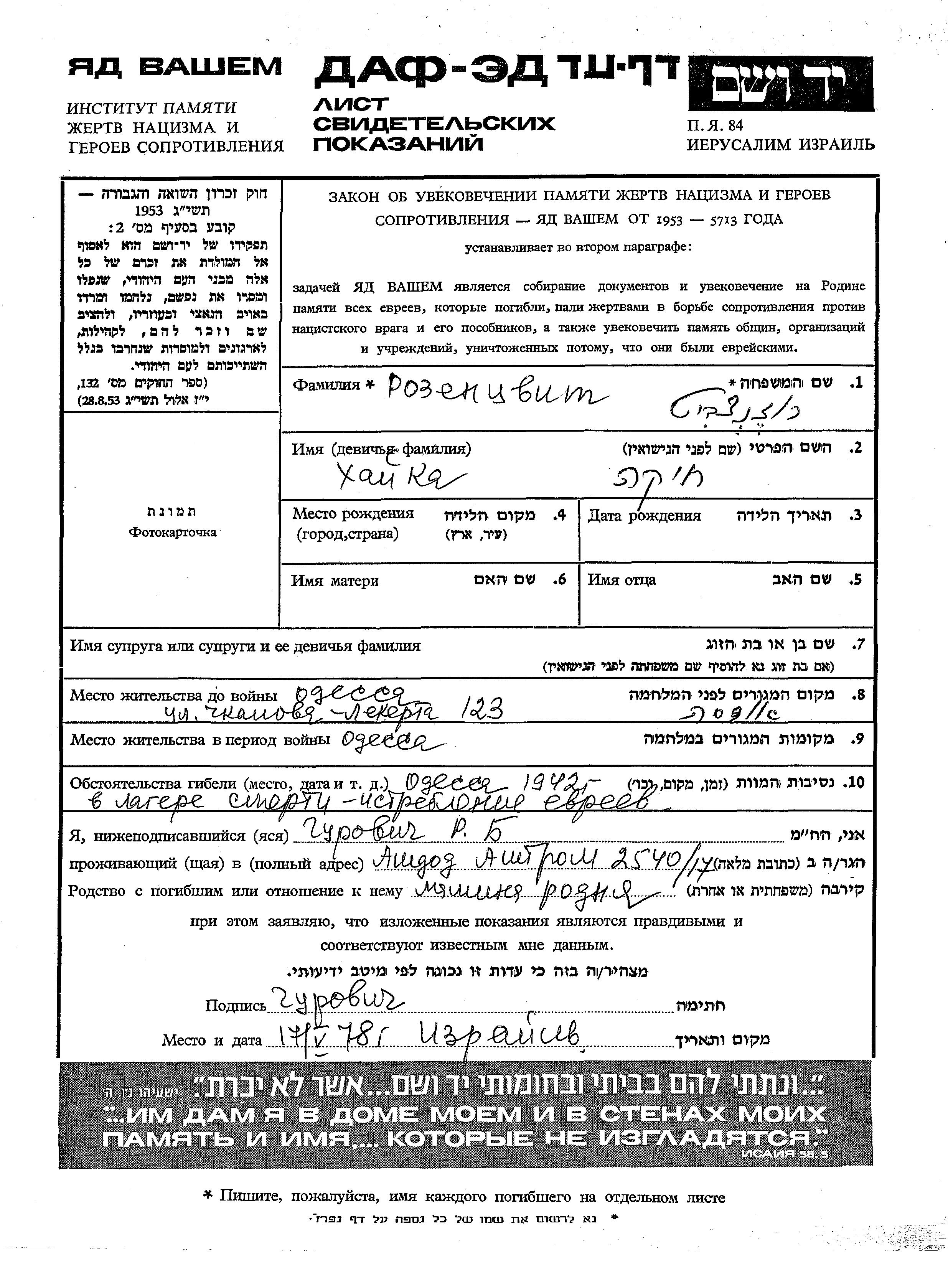 Khaika Rozentzvit. Vor dem Zweiten Weltkrieg lebte sie in Odessa, Ukraine (UdSSR). Während des Krieges war sie in Odessa, Ukraine (UdSSR).