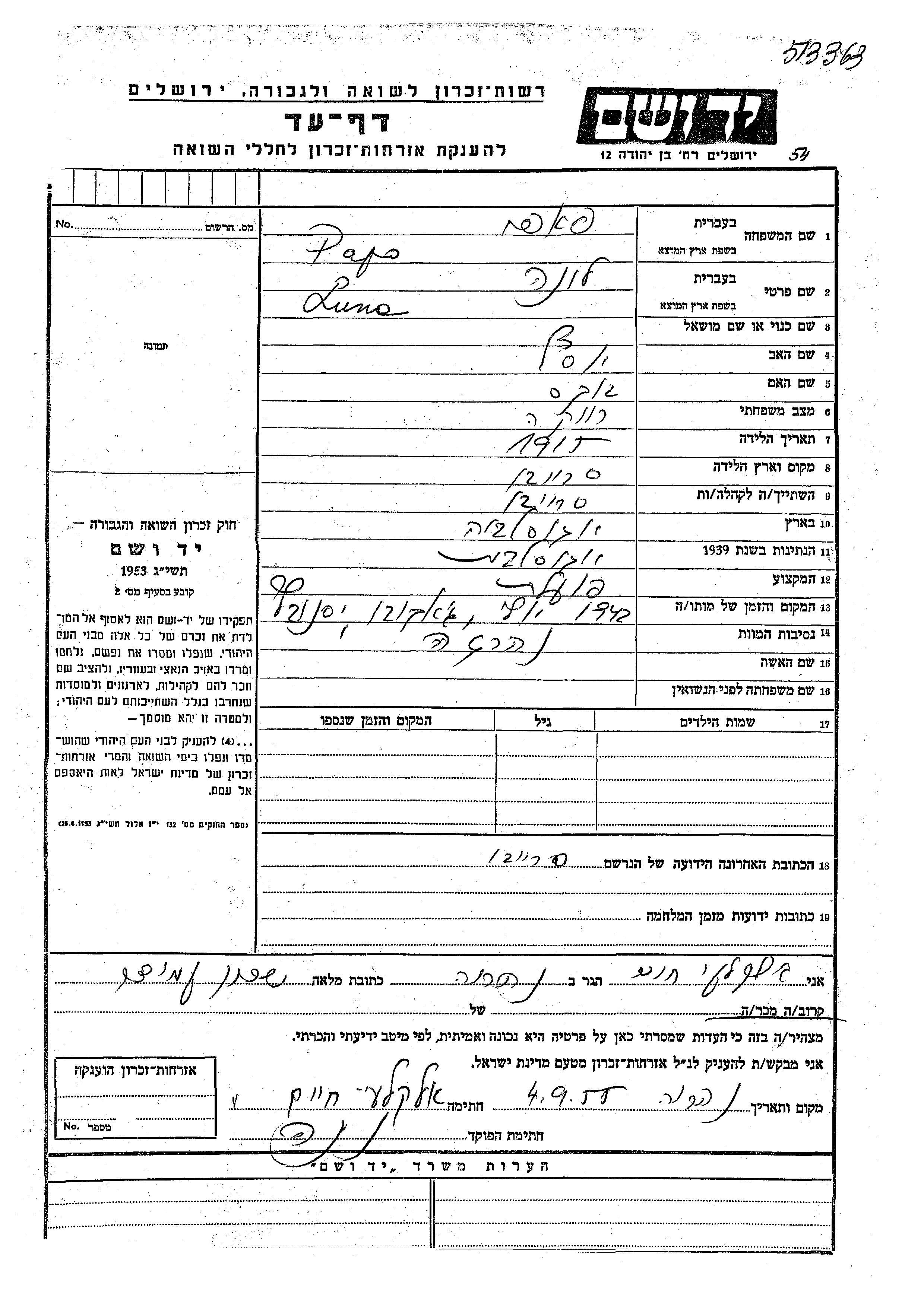 Luna Papo wurde im Jahr 1915 in Sarajevo, Jugoslawien geboren. Sie war die Tochter von Yosef und Bukas. Sie war Arbeiter/-in und Ledig. Vor dem Zweiten Weltkrieg lebte sie in Sarajevo, Jugoslawien.