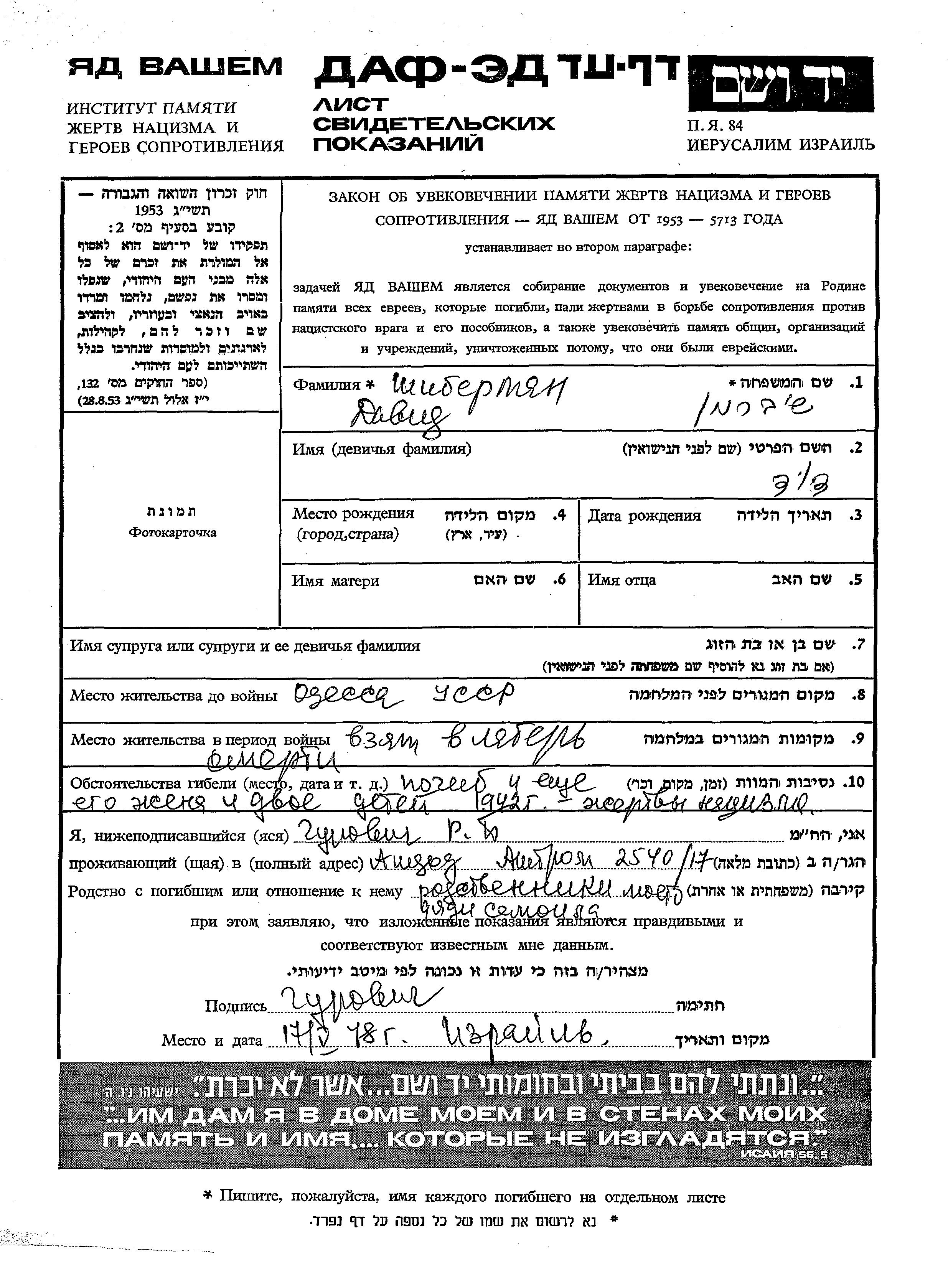 David Shiberman. Er war Verheiratet. Vor dem Zweiten Weltkrieg lebte er in Odessa, Ukraine (UdSSR).
