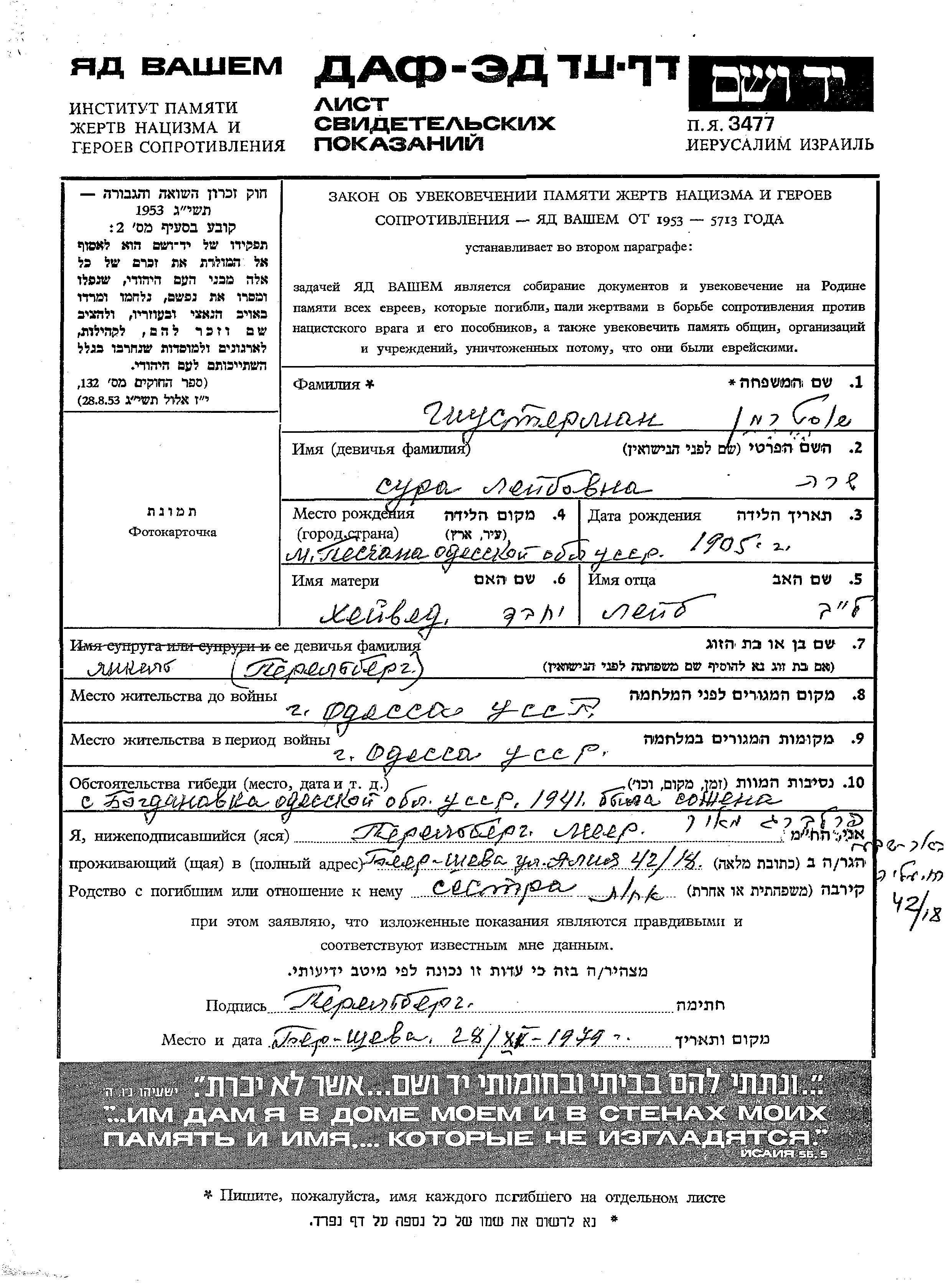 Sura Shusterman, geb. Perelberg wurde im Jahr 1905 in Peschanaya, Ukraine (UdSSR) geboren. Sie war die Tochter von Leib und Kheived. Sie war mit Yankel Verheiratet. Vor dem Zweiten Weltkrieg lebte sie in Odessa, Ukraine (UdSSR). Während des Krieges war sie in Odessa, Ukraine (UdSSR).