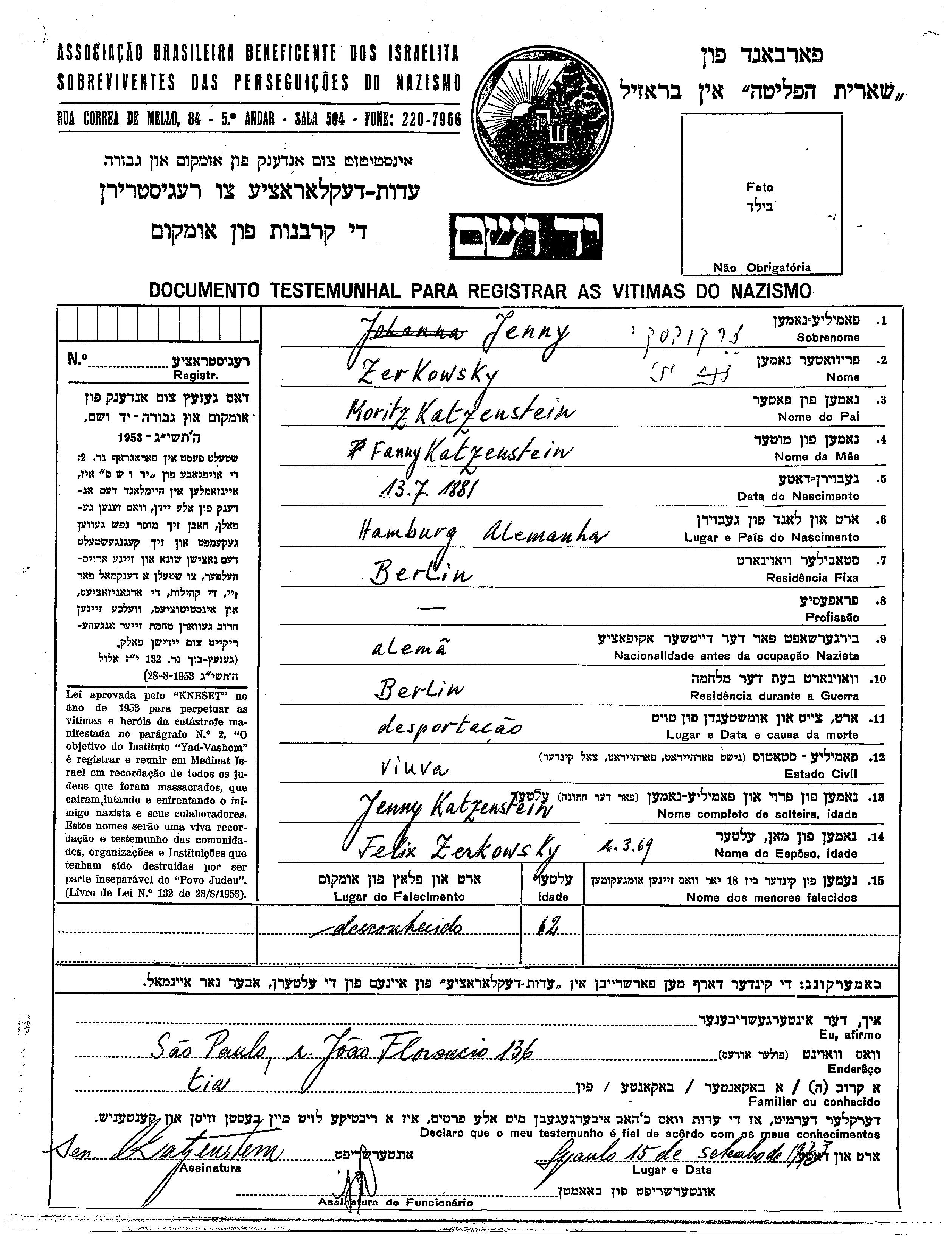 Vorname unbekannt Zerkowsky wurde Er/sie war der/ die Sohn/Tochter von Felix und Jenny Ieni, geb. Katzenstein. Er/Sie war Kind. Vor dem Zweiten Weltkrieg er/sie in Berlin, Deutsches Reich. Während des Krieges war er/sie in Berlin, Deutsches Reich.