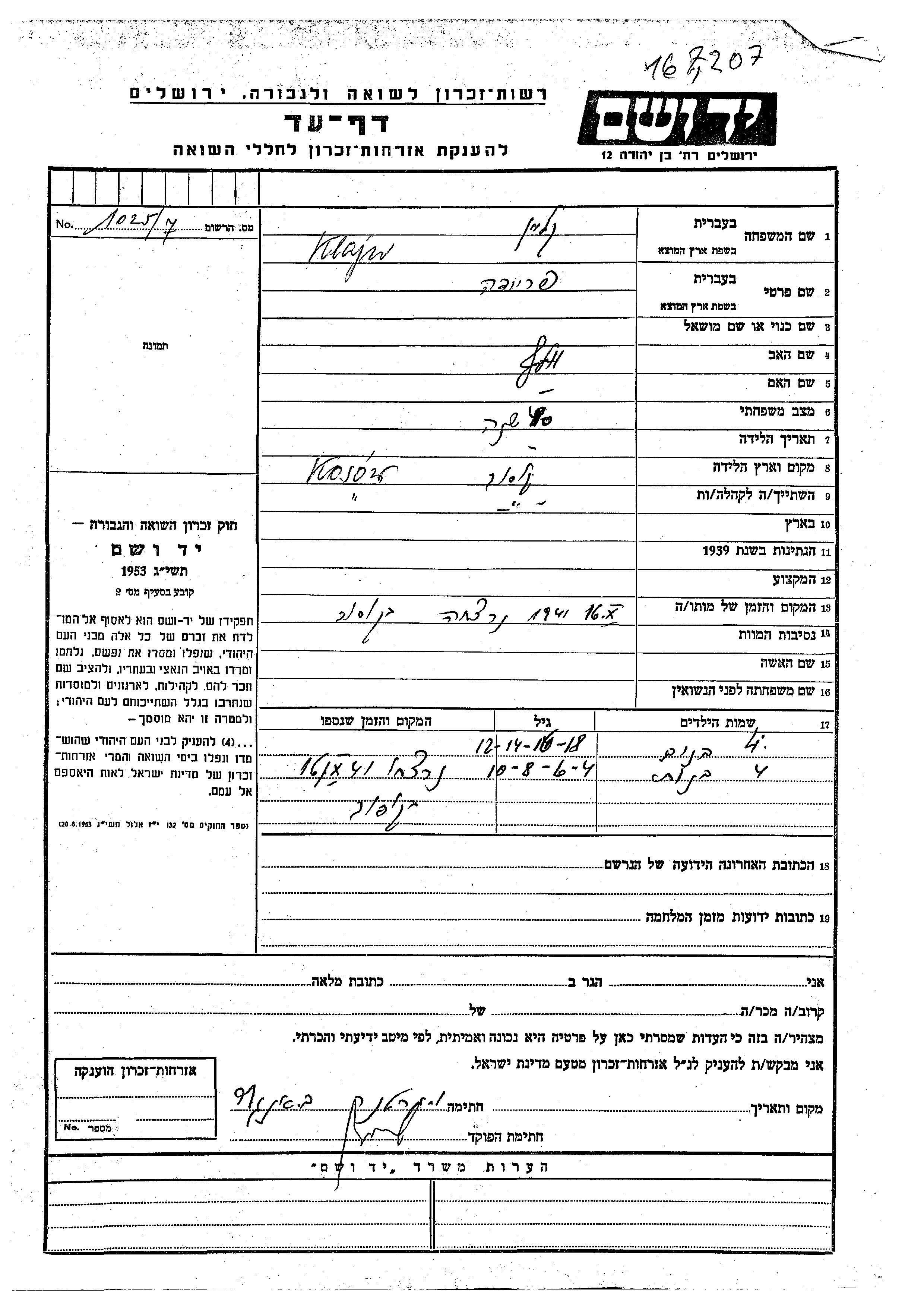Klajn Vorname unbekannt unbekannter Ort, Gedenkblatt