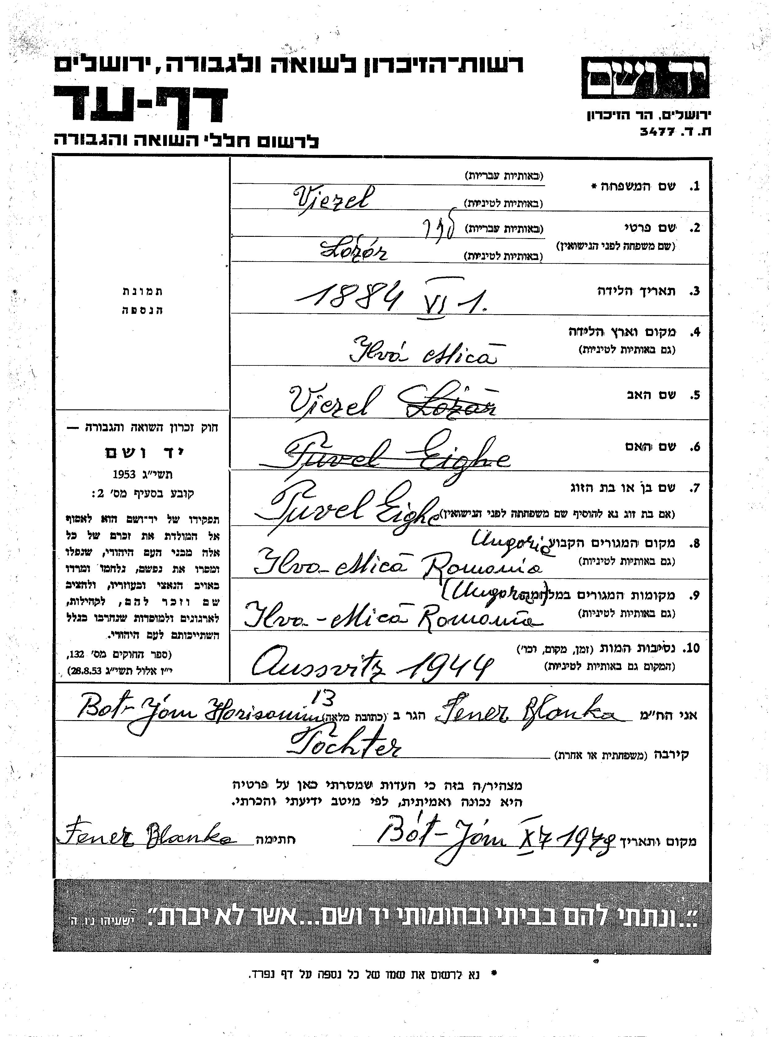 Lazar Viezel wurde im Jahr 1884 in Ilva Mica, Rumänien geboren. Er war mit Eighe, geb. Tuvel Verheiratet. Vor dem Zweiten Weltkrieg lebte er in Ilva Mica, Rumänien. Während des Krieges war er in Ilva Mica, Rumänien.